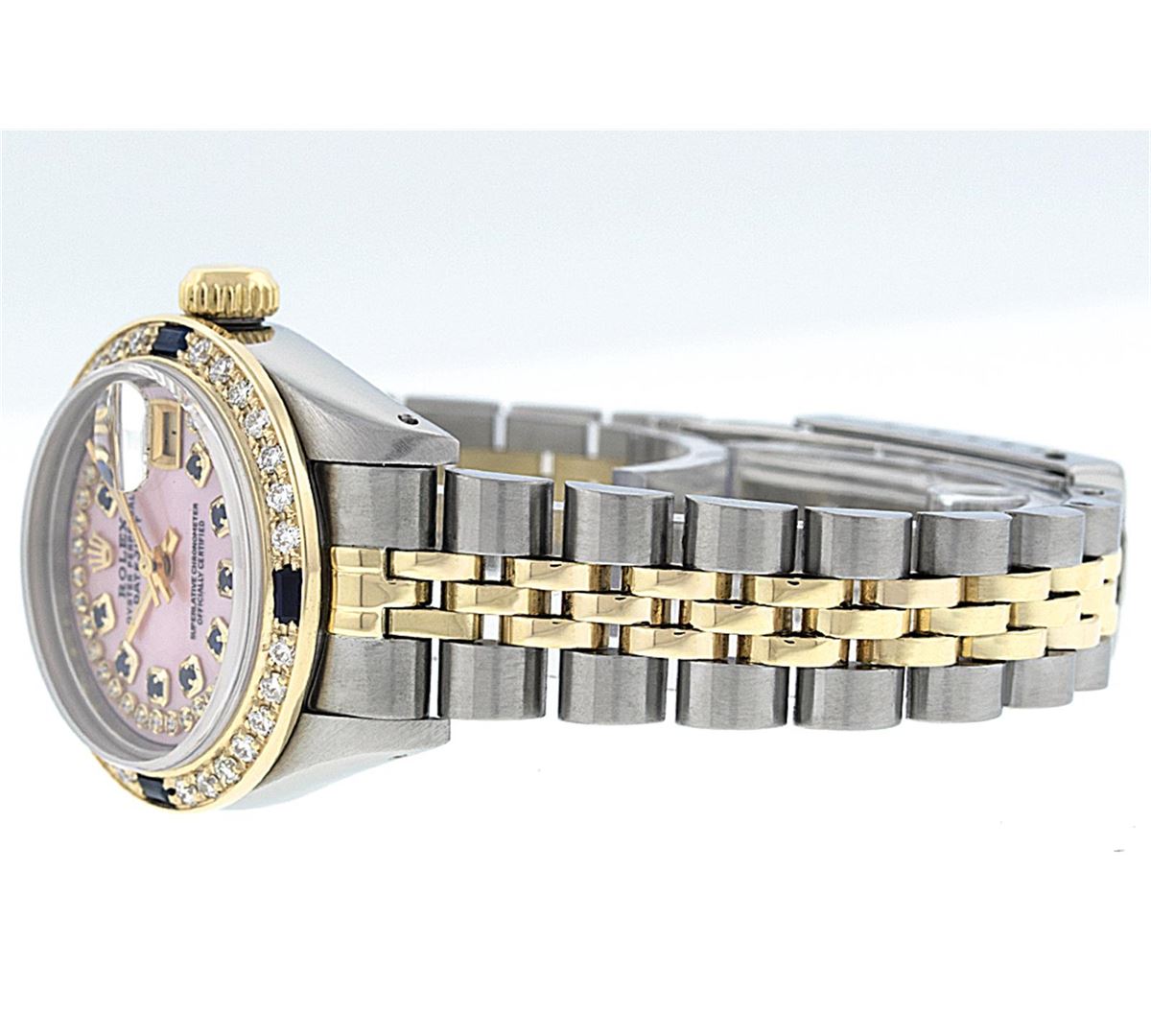 One Ladies Rolex Two Tone Rolex Datejust Polished, Serviced & Electronically Tested, 14K Yellow Gold & Stainless Steel Case:26mm, 14K Yellow Gold Crown, Custom Bezel: 18K Yellow Gold Sapphire Beadset Diamond Bezel, Diamond Count: 28 Diamonds + 4 Sapphires Total Weight .70 Carat, Clarity: Si-VS, Color: G to H. Custom Crystal: Synthetic Sapphire Cyclops Lens. Movement: Automatic Winding Movement Caliber 2030. Custom Dial: Pink Mother Of Pearl With Sapphire String Diamond Dial, Stone Count: 10 Sapphires + 33 Diamonds. Date Window: 3 O'Clock Position Date Display, Model: Datejust. Condition: G-6 Extra Fine. Bracelet: Two Tone 14K Yellow Gold & Stainless Steel Jubilee. Bright Polish. 6.0 Inch Length, Adjustable. Standard Clasp, With Rolex Logo. Comes with 6 month warranty.