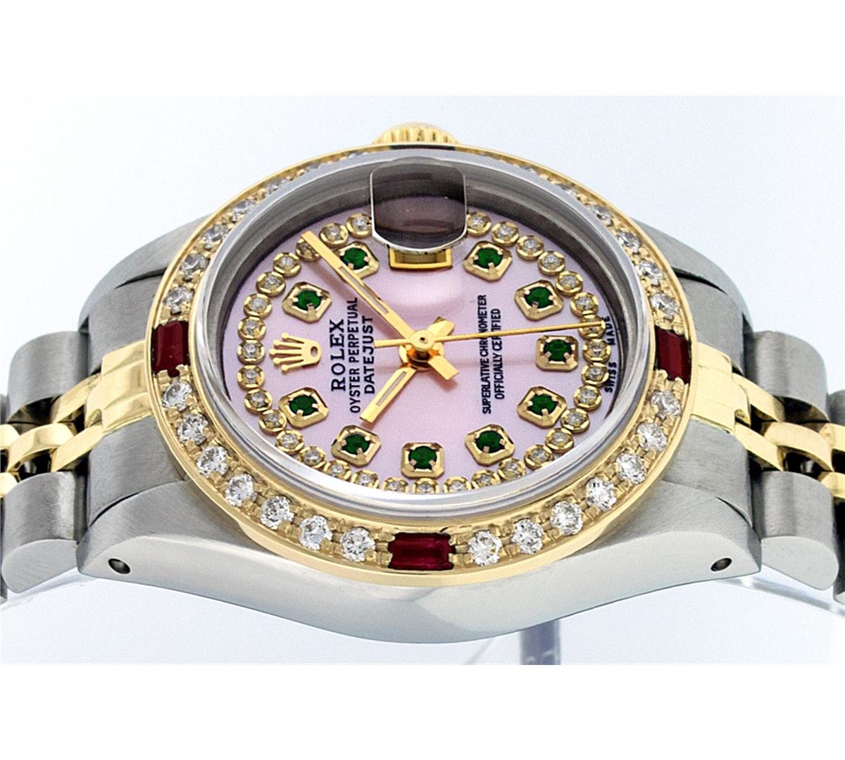 One Ladies Two Tone Rolex Datejust Polished, Serviced & Electronically Tested, 14K Yellow Gold & Stainless Steel Case:26mm, 14K Yellow Gold Crown, Custom Bezel: 18K Yellow Gold Ruby Beadset Diamond Bezel, Diamond & Stone Count: 28 Diamonds + 4 Rubies. Total Weight .70 Carat, Clarity: Si-VS, Color: G to H. Custom Crystal: Synthetic Sapphire Cyclops Lens. Movement: Automatic Winding Movement Caliber 2030. Custom Dial: Mother Of Pearl Emerald String Diamond Dial, Diamond And Emerald Count: 33 Diamonds + 10 Emeralds, Clarity: SI-VS, Color: G to H. Date Window: 3 O'Clock Position Date Display, Model: Datejust. Condition: G-6 Extra Fine. Bracelet: Two Tone 14K Yellow Gold & Stainless Steel Jubilee. Bright Polish. 5.5 Inch Length, Adjustable. Standard Clasp, With Rolex Logo. Comes with a 6 month warranty card.
