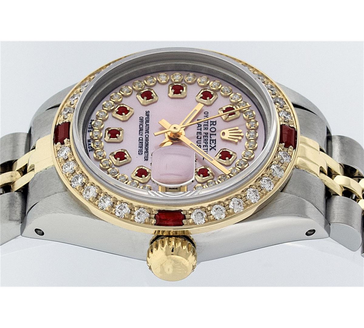 One Ladies Two Tone Rolex Datejust Polished, Serviced & Electronically Tested, 14K Yellow Gold & Stainless Steel Case:26mm, 14K Yellow Gold Crown, Custom Bezel: 18K Yellow Gold Ruby Beadset Diamond Bezel, Diamond Count: 28 Diamonds + 4 Rubies Total Weight .70 Carat, Clarity: Si-VS, Color: G to H. Custom Crystal: Synthetic Sapphire Cyclops Lens. Movement: Automatic Winding Movement Caliber 2030. Custom Dial: Pink Mother Of Pearl With Ruby String Diamond Dial, Stone Count: 10 Rubies + 33 Diamonds. Date Window: 3 O'Clock Position Date Display, Model: Datejust. Condition: G-6 Extra Fine. Bracelet: Two Tone 14K Yellow Gold & Stainless Steel Jubilee. Bright Polish. 5.5 Inch Length, Adjustable. Standard Clasp, With Rolex Logo. Comes with a 6 month warranty card.