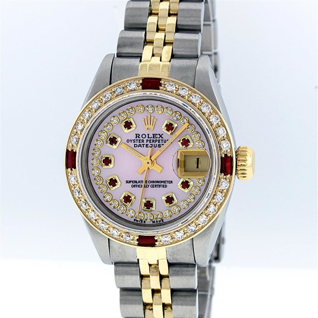One Ladies Two Tone Rolex Datejust Polished, Serviced & Electronically Tested, 14K Yellow Gold & Stainless Steel Case:26mm, 14K Yellow Gold Crown, Custom Bezel: 18K Yellow Gold Ruby Beadset Diamond Bezel, Diamond Count: 28 Diamonds + 4 Rubies Total Weight .70 Carat, Clarity: Si-VS, Color: G to H. Custom Crystal: Synthetic Sapphire Cyclops Lens. Movement: Automatic Winding Movement Caliber 2030. Custom Dial: Pink Mother Of Pearl With Ruby String Diamond Dial, Stone Count: 10 Rubies + 33 Diamonds. Date Window: 3 O'Clock Position Date Display, Model: Datejust. Condition: G-6 Extra Fine. Bracelet: Two Tone 14K Yellow Gold & Stainless Steel Jubilee. Bright Polish. 5.5 Inch Length, Adjustable. Standard Clasp, With Rolex Logo. Comes with a 6 month warranty card.