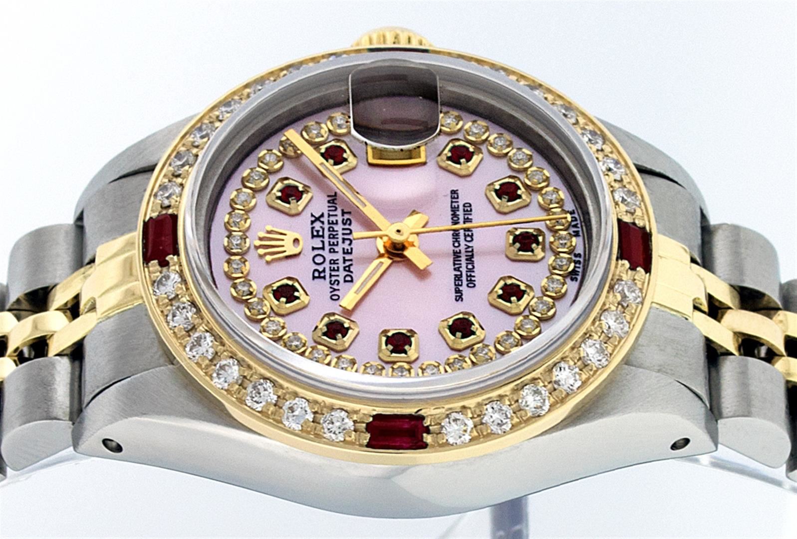 One Ladies Two Tone Rolex Datejust Polished, Serviced & Electronically Tested, 14K Yellow Gold & Stainless Steel Case:26mm, 14K Yellow Gold Crown, Custom Bezel: 18K Yellow Gold Ruby Beadset Diamond Bezel, Diamond Count: 28 Diamonds + 4 Rubies Total Weight .70 Carat, Clarity: Si-VS, Color: G to H. Custom Crystal: Synthetic Sapphire Cyclops Lens. Movement: Automatic Winding Movement Caliber 2030. Custom Dial: Pink Mother Of Pearl With Ruby String Diamond Dial, Stone Count: 10 Rubies + 33 Diamonds. Date Window: 3 O'Clock Position Date Display, Model: Datejust. Condition: G-6 Extra Fine. Bracelet: Two Tone 14K Yellow Gold & Stainless Steel Jubilee. Bright Polish. 5.5 Inch Length, Adjustable. Standard Clasp, With Rolex Logo. Comes with a 6 month warranty card.