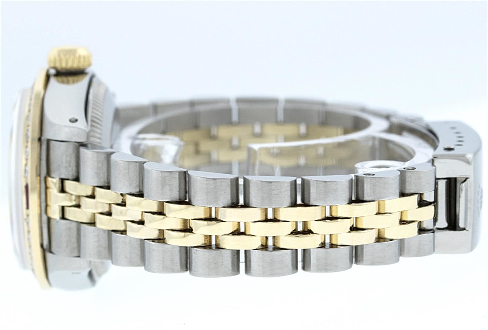 One Ladies Two Tone Rolex Datejust Polished, Serviced & Electronically Tested, 14K Yellow Gold & Stainless Steel Case:26mm, 14K Yellow Gold Crown, Custom Bezel: 18K Yellow Gold Ruby Beadset Diamond Bezel, Diamond Count: 28 Diamonds + 4 Rubies Total Weight .70 Carat, Clarity: Si-VS, Color: G to H. Custom Crystal: Synthetic Sapphire Cyclops Lens. Movement: Automatic Winding Movement Caliber 2030. Custom Dial: Pink Mother Of Pearl With Ruby String Diamond Dial, Stone Count: 10 Rubies + 33 Diamonds. Date Window: 3 O'Clock Position Date Display, Model: Datejust. Condition: G-6 Extra Fine. Bracelet: Two Tone 14K Yellow Gold & Stainless Steel Jubilee. Bright Polish. 5.5 Inch Length, Adjustable. Standard Clasp, With Rolex Logo. Comes with a 6 month warranty card.