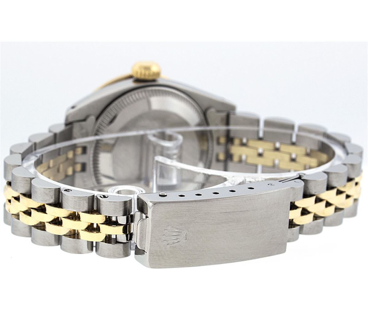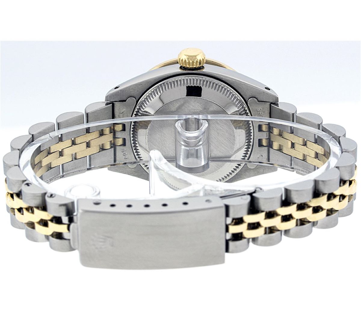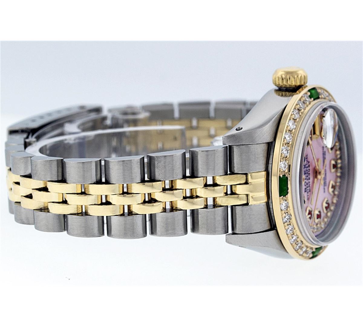 One Ladies Two Tone Rolex Datejust Polished, Serviced & Electronically Tested, 14K Yellow Gold & Stainless Steel Case:26mm, 14K Yellow Gold Crown, Custom Bezel: 18K Yellow Gold Emerald Beadset Diamond Bezel, Diamond & Stone Count: 28 Diamonds + 4 Emeralds. Total Weight .70 Carat, Clarity: Si-VS, Color: G to H. Custom Crystal: Synthetic Sapphire Cyclops Lens. Movement: Automatic Winding Movement Caliber 2030. Custom Dial: Mother Of Pearl Ruby String Diamond Dial, Diamond And Ruby Count: 33 Diamonds + 10 Rubies, Clarity: SI-VS, Color: G to H. Date Window: 3 O'Clock Position Date Display, Model: Datejust. Condition: G-6 Extra Fine. Bracelet: Two Tone 14K Yellow Gold & Stainless Steel Jubilee. Bright Polish. 5.5 Inch Length, Adjustable. Standard Clasp, With Rolex Logo. Comes with a 6 month warranty card.