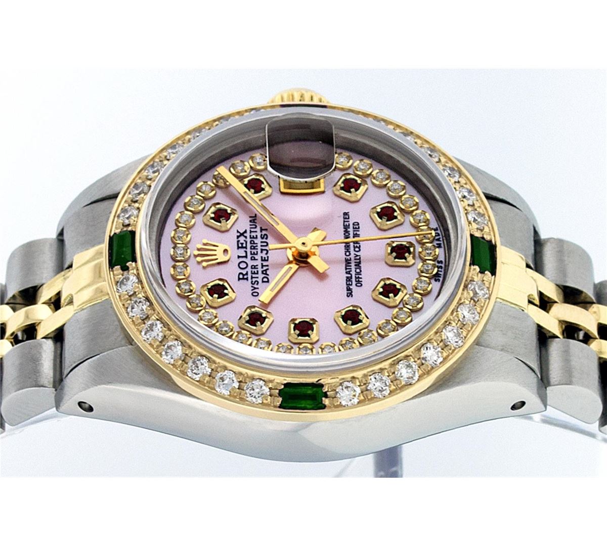 One Ladies Two Tone Rolex Datejust Polished, Serviced & Electronically Tested, 14K Yellow Gold & Stainless Steel Case:26mm, 14K Yellow Gold Crown, Custom Bezel: 18K Yellow Gold Emerald Beadset Diamond Bezel, Diamond & Stone Count: 28 Diamonds + 4 Emeralds. Total Weight .70 Carat, Clarity: Si-VS, Color: G to H. Custom Crystal: Synthetic Sapphire Cyclops Lens. Movement: Automatic Winding Movement Caliber 2030. Custom Dial: Mother Of Pearl Ruby String Diamond Dial, Diamond And Ruby Count: 33 Diamonds + 10 Rubies, Clarity: SI-VS, Color: G to H. Date Window: 3 O'Clock Position Date Display, Model: Datejust. Condition: G-6 Extra Fine. Bracelet: Two Tone 14K Yellow Gold & Stainless Steel Jubilee. Bright Polish. 5.5 Inch Length, Adjustable. Standard Clasp, With Rolex Logo. Comes with a 6 month warranty card.