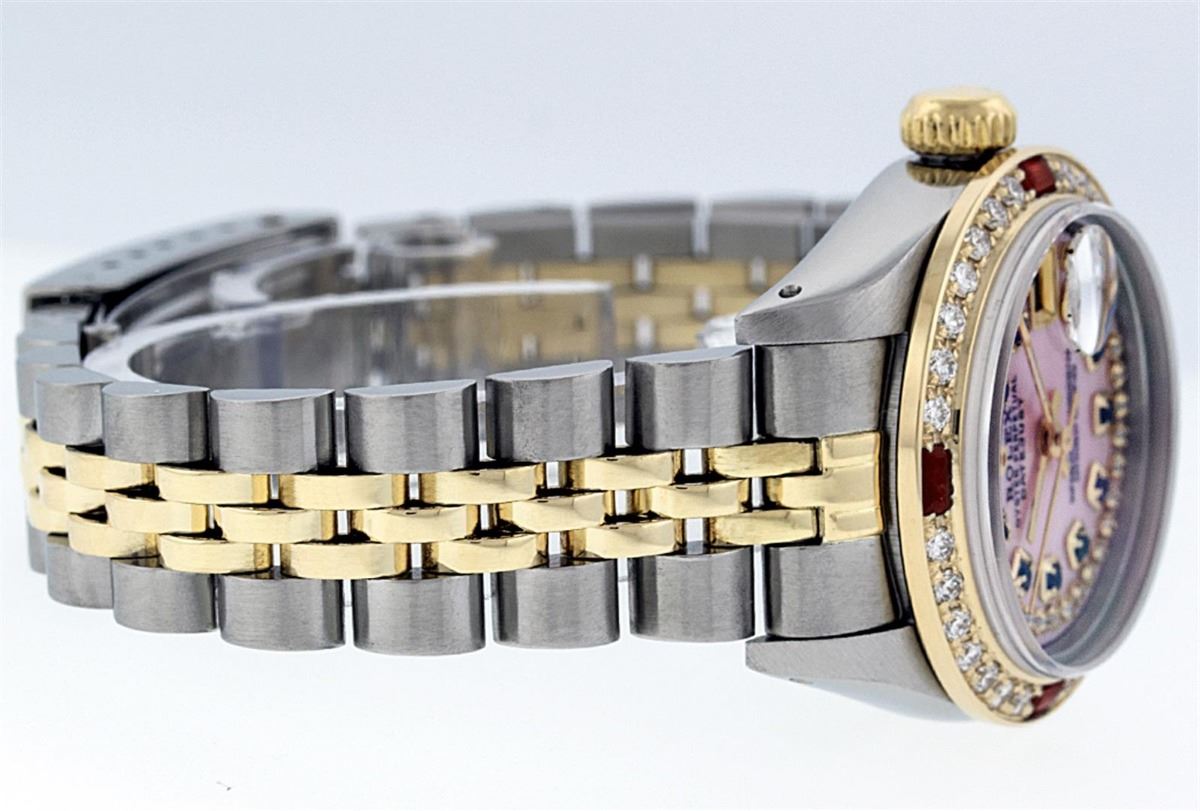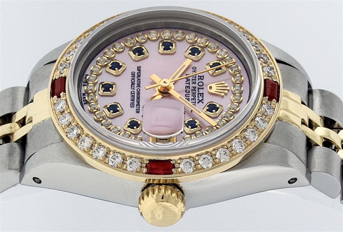 One Ladies Two Tone Rolex Datejust Polished, Serviced & Electronically Tested, 14K Yellow Gold & Stainless Steel Case:26mm, 14K Yellow Gold Crown, Custom Bezel: 18K Yellow Gold Ruby Beadset Diamond Bezel, Diamond & Stone Count: 28 Diamonds + 4 Rubies. Total Weight .70 Carat, Clarity: Si-VS, Color: G to H. Custom Crystal: Synthetic Sapphire Cyclops Lens. Movement: Automatic Winding Movement Caliber 2030. Custom Dial: Mother Of Pearl Sapphire String Diamond Dial, Diamond And Sapphire Count: 33 Diamonds + 10 Sapphires, Clarity: SI-VS, Color: G to H. Date Window: 3 O'Clock Position Date Display, Model: Datejust. Condition: G-6 Extra Fine. Bracelet: Two Tone 14K Yellow Gold & Stainless Steel Jubilee. Bright Polish. 5.5 Inch Length, Adjustable. Standard Clasp, With Rolex Logo. Comes with a 6 month warranty card.