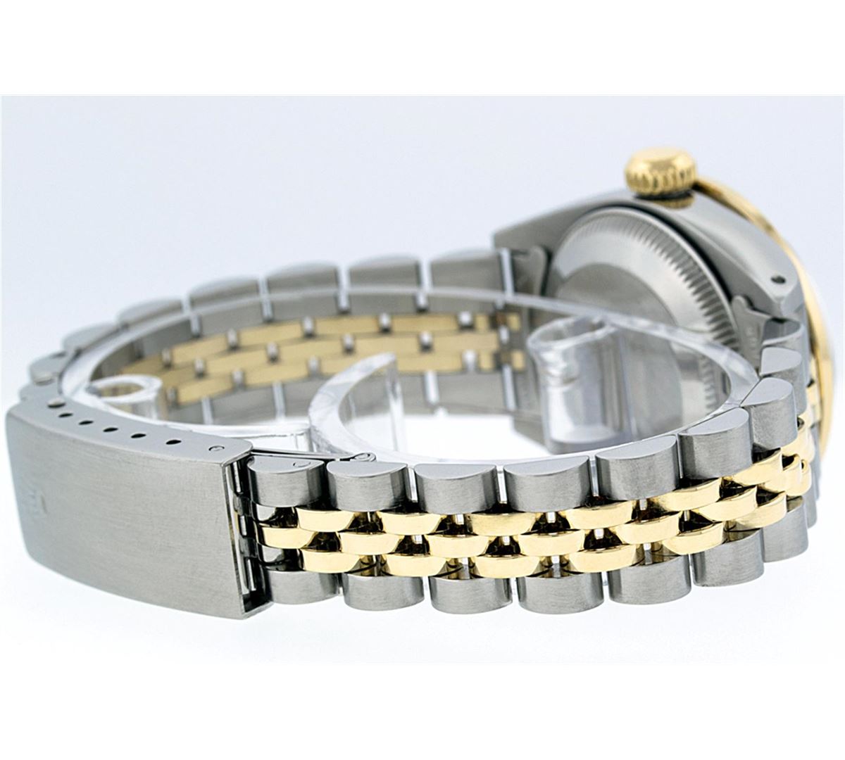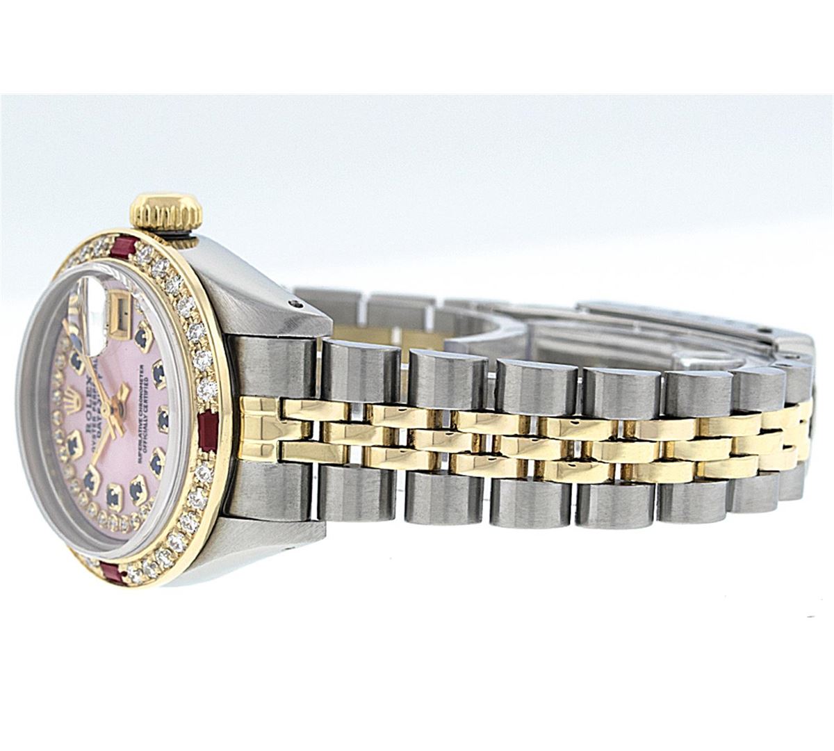 One Ladies Two Tone Rolex Datejust Polished, Serviced & Electronically Tested, 14K Yellow Gold & Stainless Steel Case:26mm, 14K Yellow Gold Crown, Custom Bezel: 18K Yellow Gold Ruby Beadset Diamond Bezel, Diamond & Stone Count: 28 Diamonds + 4 Rubies. Total Weight .70 Carat, Clarity: Si-VS, Color: G to H. Custom Crystal: Synthetic Sapphire Cyclops Lens. Movement: Automatic Winding Movement Caliber 2030. Custom Dial: Mother Of Pearl Sapphire String Diamond Dial, Diamond And Sapphire Count: 33 Diamonds + 10 Sapphires, Clarity: SI-VS, Color: G to H. Date Window: 3 O'Clock Position Date Display, Model: Datejust. Condition: G-6 Extra Fine. Bracelet: Two Tone 14K Yellow Gold & Stainless Steel Jubilee. Bright Polish. 5.5 Inch Length, Adjustable. Standard Clasp, With Rolex Logo. Comes with a 6 month warranty card.
