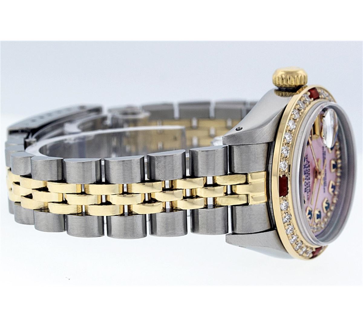 One Ladies Two Tone Rolex Datejust Polished, Serviced & Electronically Tested, 14K Yellow Gold & Stainless Steel Case:26mm, 14K Yellow Gold Crown, Custom Bezel: 18K Yellow Gold Ruby Beadset Diamond Bezel, Diamond & Stone Count: 28 Diamonds + 4 Rubies. Total Weight .70 Carat, Clarity: Si-VS, Color: G to H. Custom Crystal: Synthetic Sapphire Cyclops Lens. Movement: Automatic Winding Movement Caliber 2030. Custom Dial: Mother Of Pearl Sapphire String Diamond Dial, Diamond And Sapphire Count: 33 Diamonds + 10 Sapphires, Clarity: SI-VS, Color: G to H. Date Window: 3 O'Clock Position Date Display, Model: Datejust. Condition: G-6 Extra Fine. Bracelet: Two Tone 14K Yellow Gold & Stainless Steel Jubilee. Bright Polish. 5.5 Inch Length, Adjustable. Standard Clasp, With Rolex Logo. Comes with a 6 month warranty card.