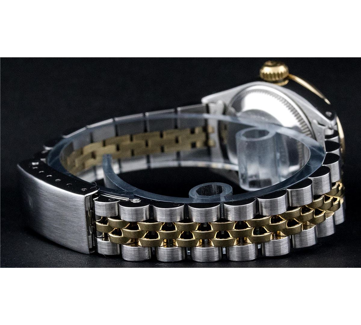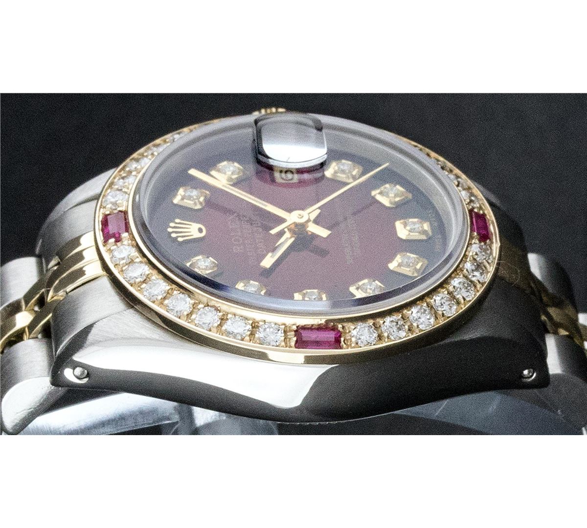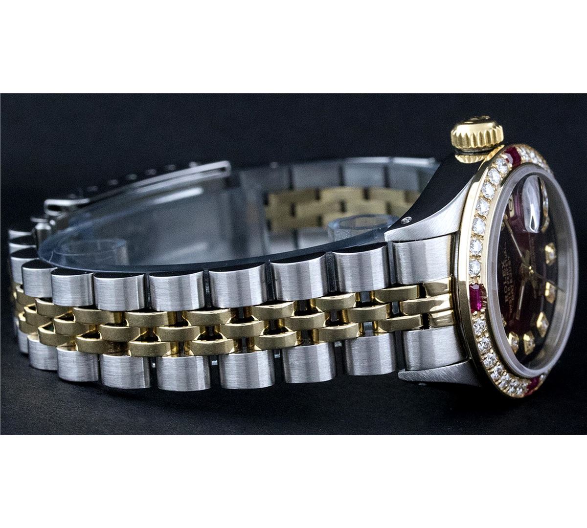 One Ladies Two Tone Rolex Datejust Polished, Serviced & Electronically Tested, 14K Yellow Gold & Stainless Steel Case:26mm, 14K Yellow Gold Crown, Custom Bezel: 18K Yellow Gold Ruby Beadset Diamond Bezel, Diamond Count: 28 Diamonds + 4 Rubies Total Weight .70 Carat, Clarity: Si-VS, Color: G to H. Custom Crystal: Synthetic Sapphire Cyclops Lens. Movement: Automatic Winding Movement Caliber 2030. Custom Dial: Dark Red Vignette With Diamond Hour Markers. 10 Diamonds In Dial, Clarity: Si-VS, Color: G to H. Date Window: 3 O'Clock Position Date Display, Non Quickset, Model: 6917 Condition: G-6 Extra Fine. Bracelet: Two Tone 14K Yellow Gold & Stainless Steel Jubilee. Bright Polish. 5.5 Inch Length, Adjustable. Standard Clasp, With Rolex Logo.