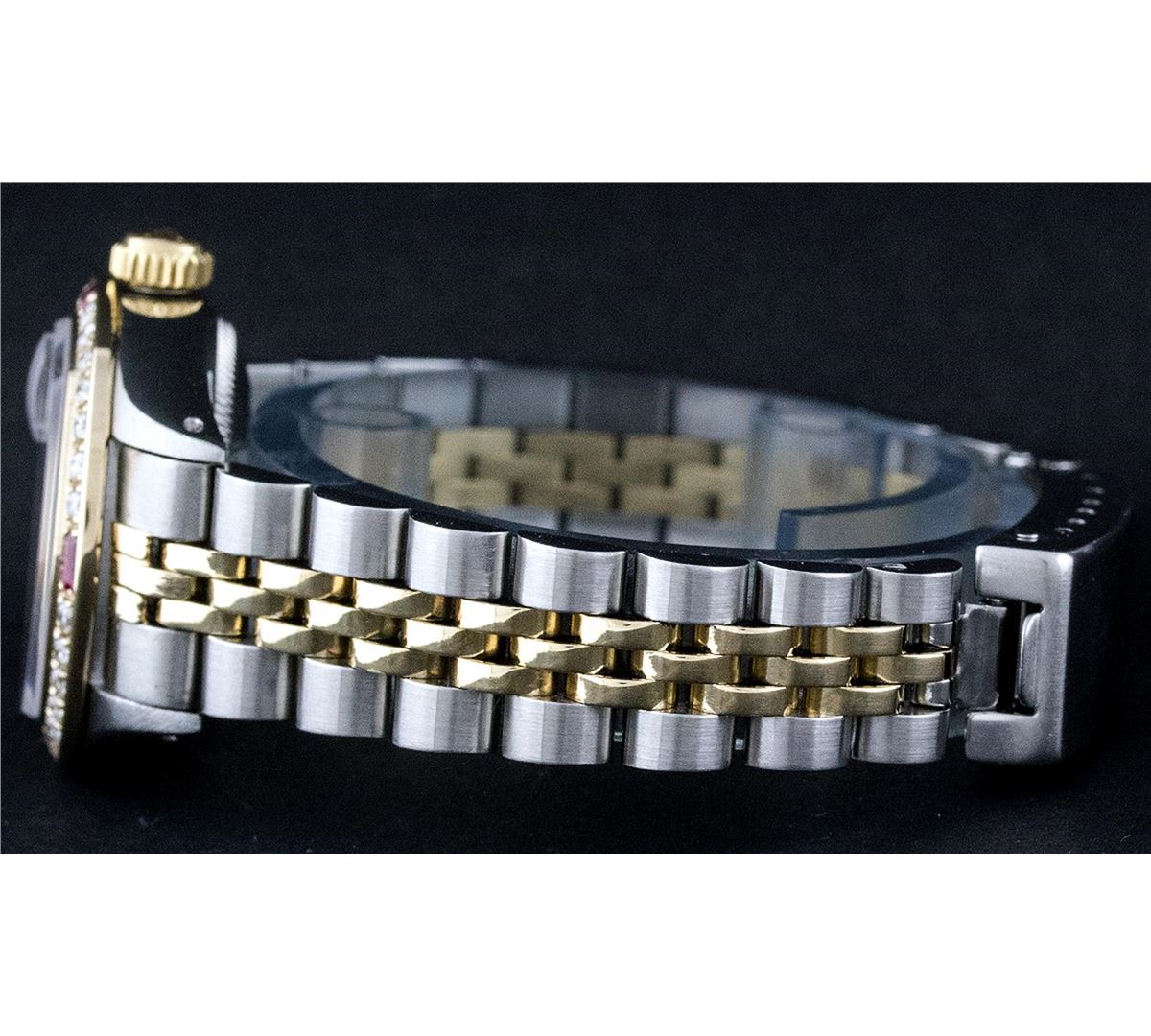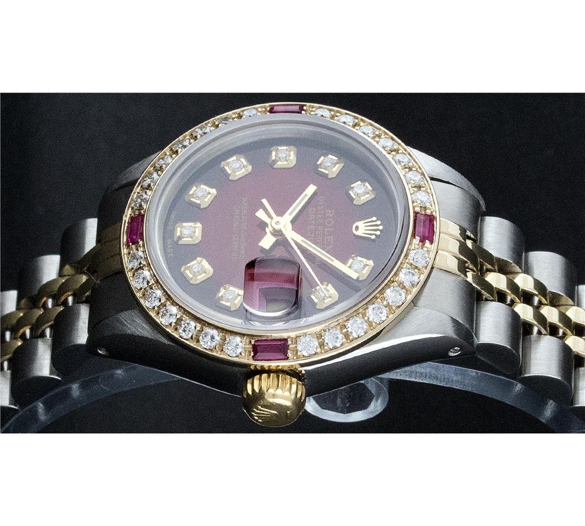 One Ladies Two Tone Rolex Datejust Polished, Serviced & Electronically Tested, 14K Yellow Gold & Stainless Steel Case:26mm, 14K Yellow Gold Crown, Custom Bezel: 18K Yellow Gold Ruby Beadset Diamond Bezel, Diamond Count: 28 Diamonds + 4 Rubies Total Weight .70 Carat, Clarity: Si-VS, Color: G to H. Custom Crystal: Synthetic Sapphire Cyclops Lens. Movement: Automatic Winding Movement Caliber 2030. Custom Dial: Dark Red Vignette With Diamond Hour Markers. 10 Diamonds In Dial, Clarity: Si-VS, Color: G to H. Date Window: 3 O'Clock Position Date Display, Non Quickset, Model: 6917 Condition: G-6 Extra Fine. Bracelet: Two Tone 14K Yellow Gold & Stainless Steel Jubilee. Bright Polish. 5.5 Inch Length, Adjustable. Standard Clasp, With Rolex Logo.