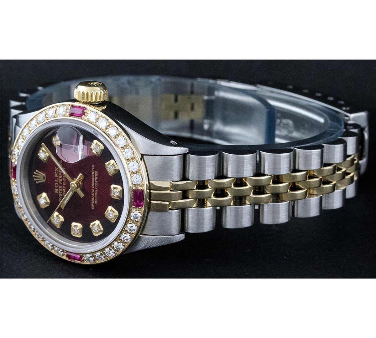 One Ladies Two Tone Rolex Datejust Polished, Serviced & Electronically Tested, 14K Yellow Gold & Stainless Steel Case:26mm, 14K Yellow Gold Crown, Custom Bezel: 18K Yellow Gold Ruby Beadset Diamond Bezel, Diamond Count: 28 Diamonds + 4 Rubies Total Weight .70 Carat, Clarity: Si-VS, Color: G to H. Custom Crystal: Synthetic Sapphire Cyclops Lens. Movement: Automatic Winding Movement Caliber 2030. Custom Dial: Dark Red Vignette With Diamond Hour Markers. 10 Diamonds In Dial, Clarity: Si-VS, Color: G to H. Date Window: 3 O'Clock Position Date Display, Non Quickset, Model: 6917 Condition: G-6 Extra Fine. Bracelet: Two Tone 14K Yellow Gold & Stainless Steel Jubilee. Bright Polish. 5.5 Inch Length, Adjustable. Standard Clasp, With Rolex Logo.