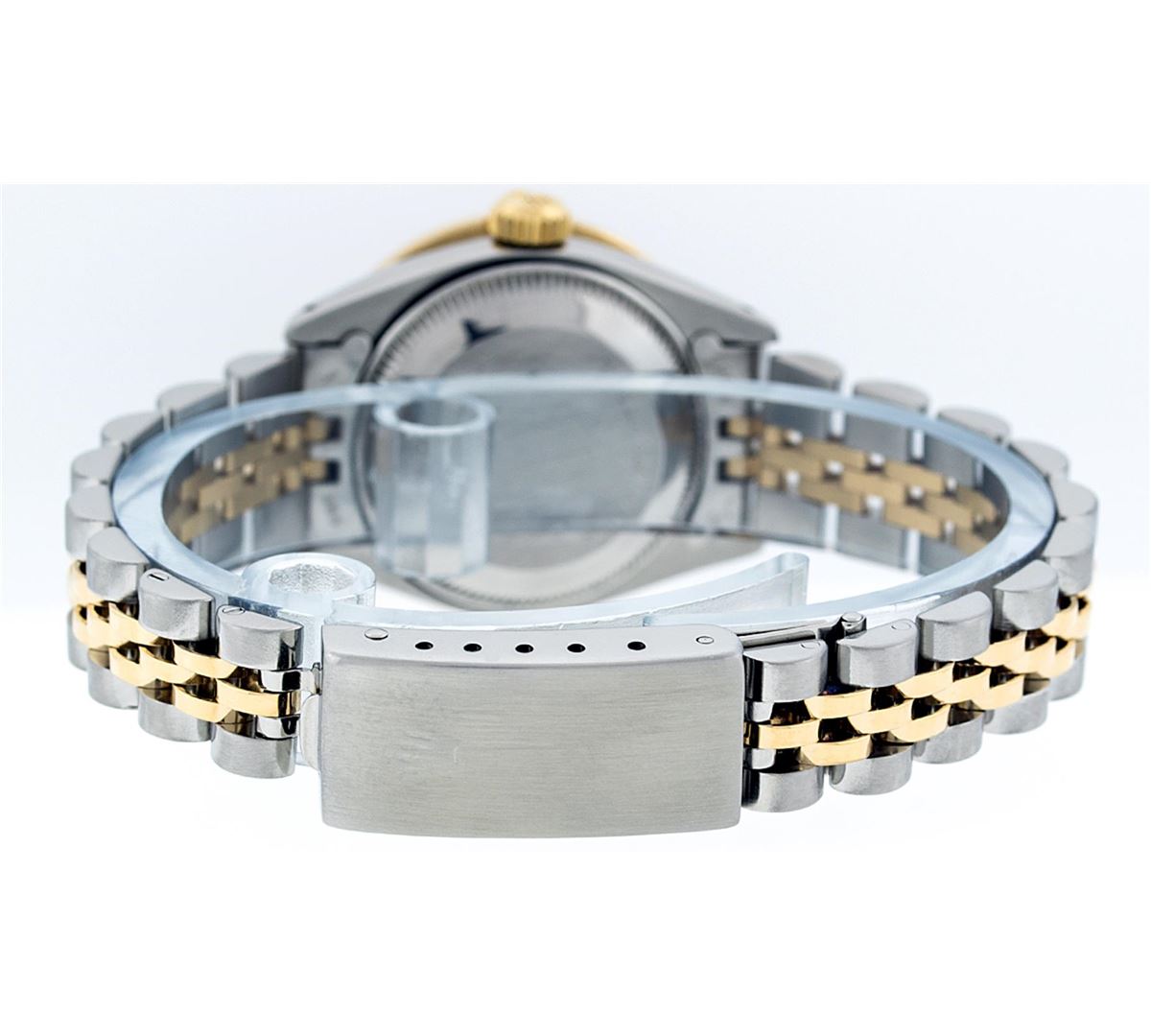 One Ladies Two Tone Rolex Datejust Polished, Serviced & Electronically Tested, 14K Yellow Gold & Stainless Steel Case:26mm, 14K Yellow Gold Crown, Custom Bezel: 18K Yellow Gold Ruby Channel Set Diamond Bezel, Diamond + Gem Count: 36 Diamonds + 4 Rubies Total Weight 1.00 Carat, Clarity: Si-VS, Color: G to H. Custom Crystal: Synthetic Sapphire Cyclops Lens. Movement: Automatic Winding Movement Caliber 2030. Custom Dial: Mother Of Pearl with Ruby Hour Markers, 10 Rubies. Date Window: 3 O'Clock Position Date Display, Model: Datejust, Condition: G-6 Extra Fine. Bracelet: Two Tone 14K Yellow Gold & Stainless Steel Jubilee. Bright Polish. 6.0 Inch Length, Adjustable. Standard Clasp, With Rolex Logo. Comes with 6 month warranty.
