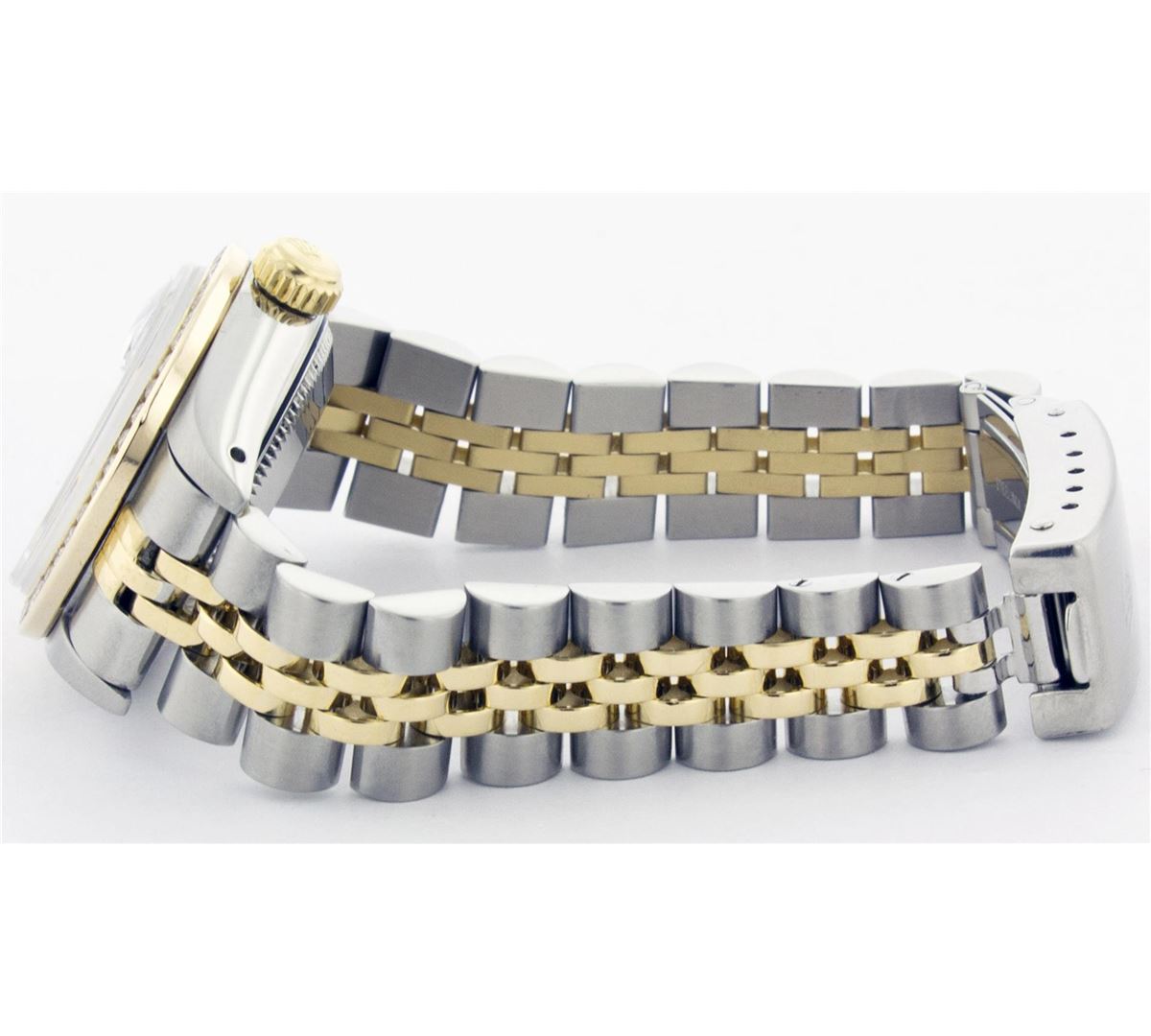 One Ladies Two Tone Rolex Datejust Polished, Serviced & Electronically Tested, 14K Yellow Gold & Stainless Steel Case:26mm, 14K Yellow Gold Crown, Custom Bezel: 18K Yellow Gold Channel Set Diamond Bezel, Diamond Count: 44 Diamonds Total Weight 1.00 Carat, Clarity: Si-VS, Color: G to H. Custom Crystal: Synthetic Sapphire Cyclops Lens. Movement: Automatic Winding Movement Caliber 2030. Custom Dial: Mother Of Pearl With Ruby Hour Markers, Stone Count: 10 Rubies. Date Window: 3 O'Clock Position Date Display, Non Quickset, Model: 6917 Condition: G-6 Extra Fine. Bracelet: Two Tone 14K Yellow Gold & Stainless Steel Jubilee. Bright Polish. 5.5 Inch Length, Adjustable. Standard Clasp, With Rolex Logo.