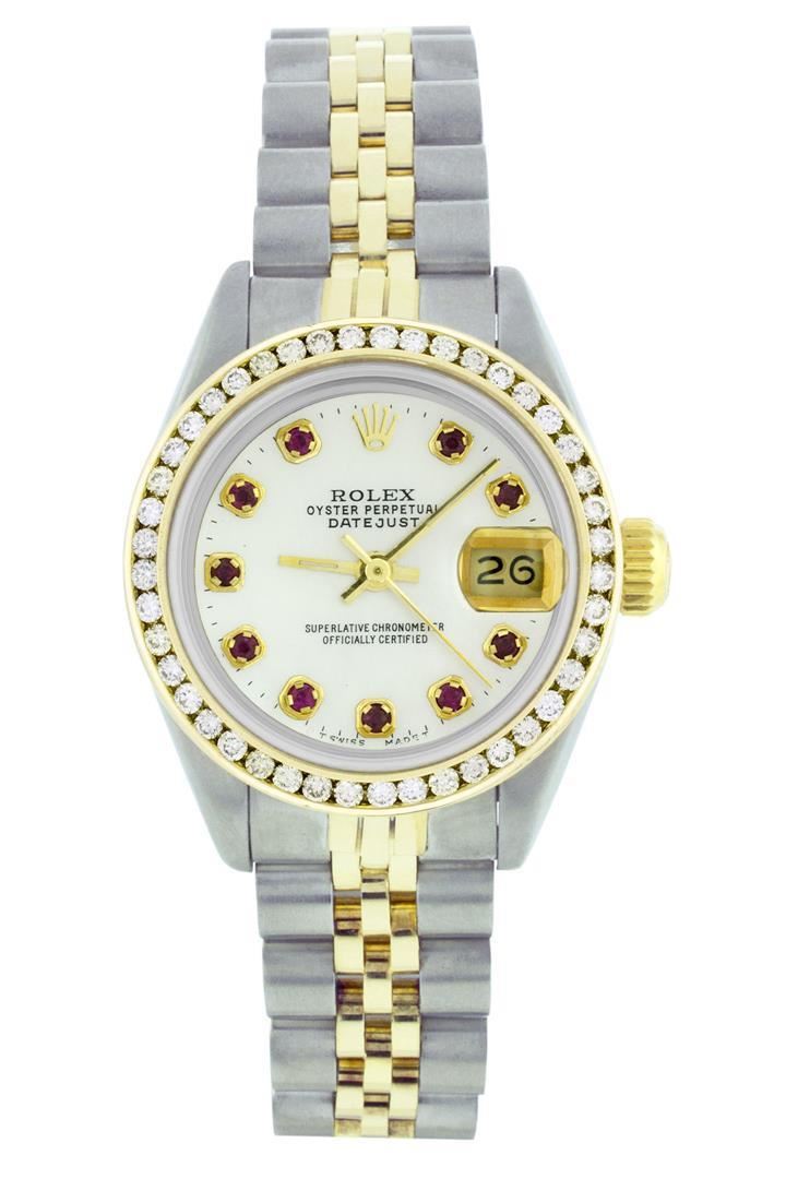 One Ladies Two Tone Rolex Datejust Polished, Serviced & Electronically Tested, 14K Yellow Gold & Stainless Steel Case:26mm, 14K Yellow Gold Crown, Custom Bezel: 18K Yellow Gold Channel Set Diamond Bezel, Diamond Count: 44 Diamonds Total Weight 1.00 Carat, Clarity: Si-VS, Color: G to H. Custom Crystal: Synthetic Sapphire Cyclops Lens. Movement: Automatic Winding Movement Caliber 2030. Custom Dial: Mother Of Pearl With Ruby Hour Markers, Stone Count: 10 Rubies. Date Window: 3 O'Clock Position Date Display, Non Quickset, Model: 6917 Condition: G-6 Extra Fine. Bracelet: Two Tone 14K Yellow Gold & Stainless Steel Jubilee. Bright Polish. 5.5 Inch Length, Adjustable. Standard Clasp, With Rolex Logo.