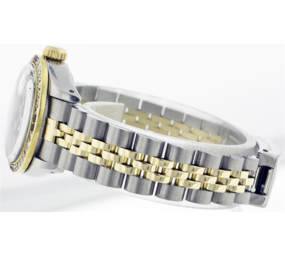 One Ladies Two Tone Rolex Datejust Polished, Serviced & Electronically Tested, 14K Yellow Gold & Stainless Steel Case:26mm, 14K Yellow Gold Crown, Custom Bezel: 18K Yellow Gold Ruby Beadset Diamond Bezel, Diamond Count: 28 Diamonds + 4 Rubies, Total Weight .70 Carat, Clarity: Si-VS, Color: G to H. Custom Crystal: Synthetic Sapphire Cyclops Lens. Movement: Automatic Winding Movement Caliber 2030. Custom Dial: Red Vignette With Diamond Hour Markers, Diamond Count: 10 Diamonds, Clarity: SI-VS, Color: G to H. Date Window: 3 O'Clock Position Date Display, Non Quickset, Model: 6917 Condition: G-6 Extra Fine. Bracelet: Two Tone 14K Yellow Gold & Stainless Steel Jubilee. Bright Polish. 5.5 Inch Length, Adjustable. Standard Clasp, With Rolex Logo.