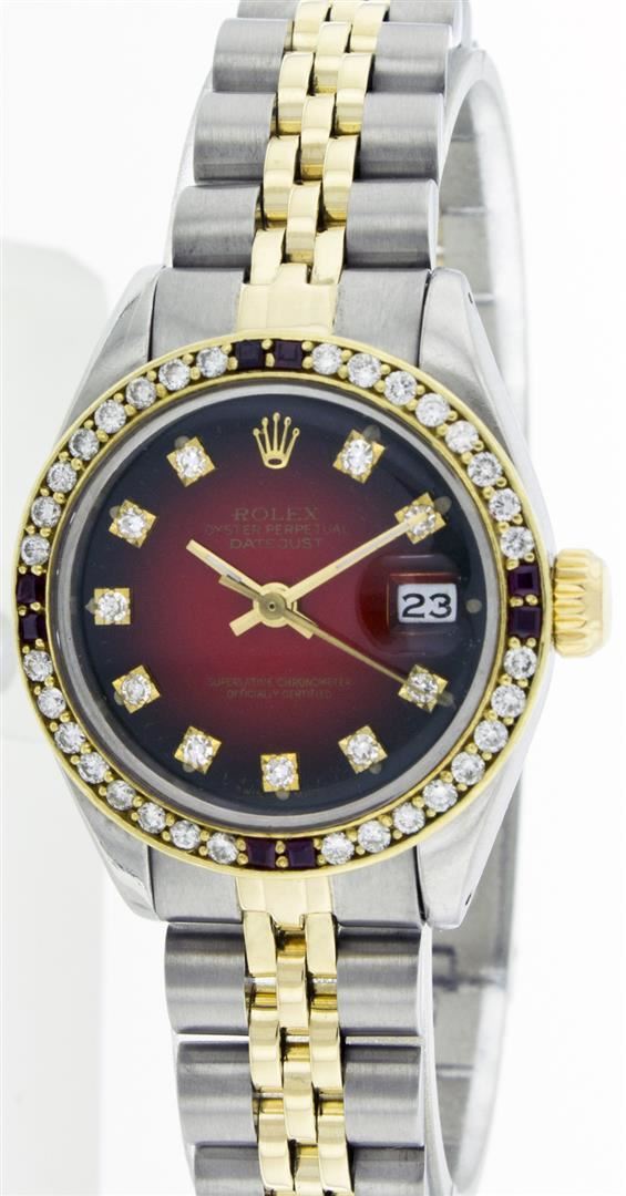One Ladies Two Tone Rolex Datejust Polished, Serviced & Electronically Tested, 14K Yellow Gold & Stainless Steel Case:26mm, 14K Yellow Gold Crown, Custom Bezel: 18K Yellow Gold Ruby Beadset Diamond Bezel, Diamond Count: 28 Diamonds + 4 Rubies, Total Weight .70 Carat, Clarity: Si-VS, Color: G to H. Custom Crystal: Synthetic Sapphire Cyclops Lens. Movement: Automatic Winding Movement Caliber 2030. Custom Dial: Red Vignette With Diamond Hour Markers, Diamond Count: 10 Diamonds, Clarity: SI-VS, Color: G to H. Date Window: 3 O'Clock Position Date Display, Non Quickset, Model: 6917 Condition: G-6 Extra Fine. Bracelet: Two Tone 14K Yellow Gold & Stainless Steel Jubilee. Bright Polish. 5.5 Inch Length, Adjustable. Standard Clasp, With Rolex Logo.