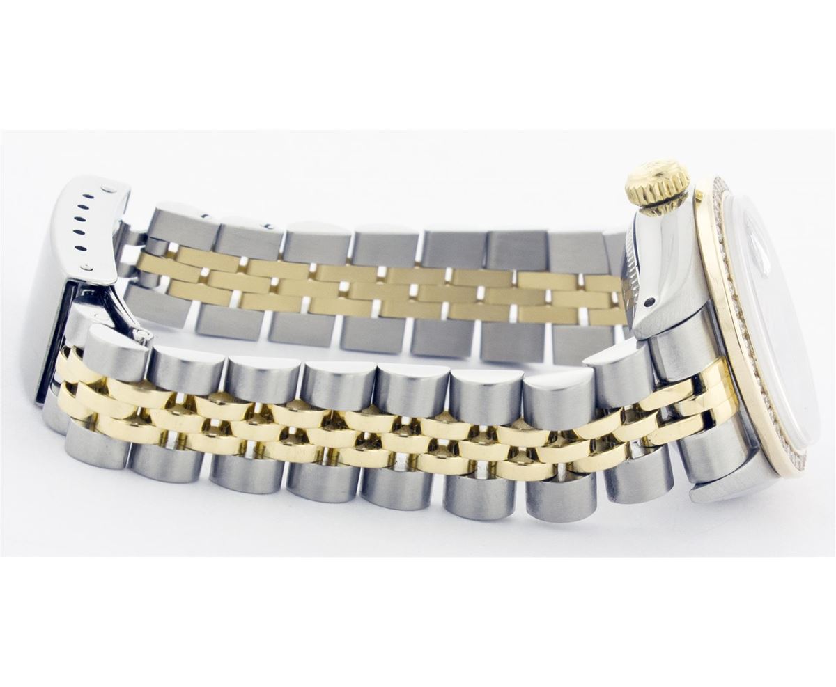 One Ladies Two Tone Rolex Datejust Polished, Serviced & Electronically Tested, 14K Yellow Gold & Stainless Steel Case:26mm, 14K Yellow Gold Crown, Custom Bezel: 18K Yellow Gold Channel Set Diamond Bezel, Diamond Count: 44 Diamonds Total Weight 1.00 Carat, Clarity: Si-VS, Color: G to H. Custom Crystal: Synthetic Sapphire Cyclops Lens. Movement: Automatic Winding Movement Caliber 2030. Custom Dial: Mother Of Pearl With Ruby Hour Markers, Stone Count: 10 Rubies. Date Window: 3 O'Clock Position Date Display, Non Quickset, Model: 6917 Condition: G-6 Extra Fine. Bracelet: Two Tone 14K Yellow Gold & Stainless Steel Jubilee. Bright Polish. 5.5 Inch Length, Adjustable. Standard Clasp, With Rolex Logo.