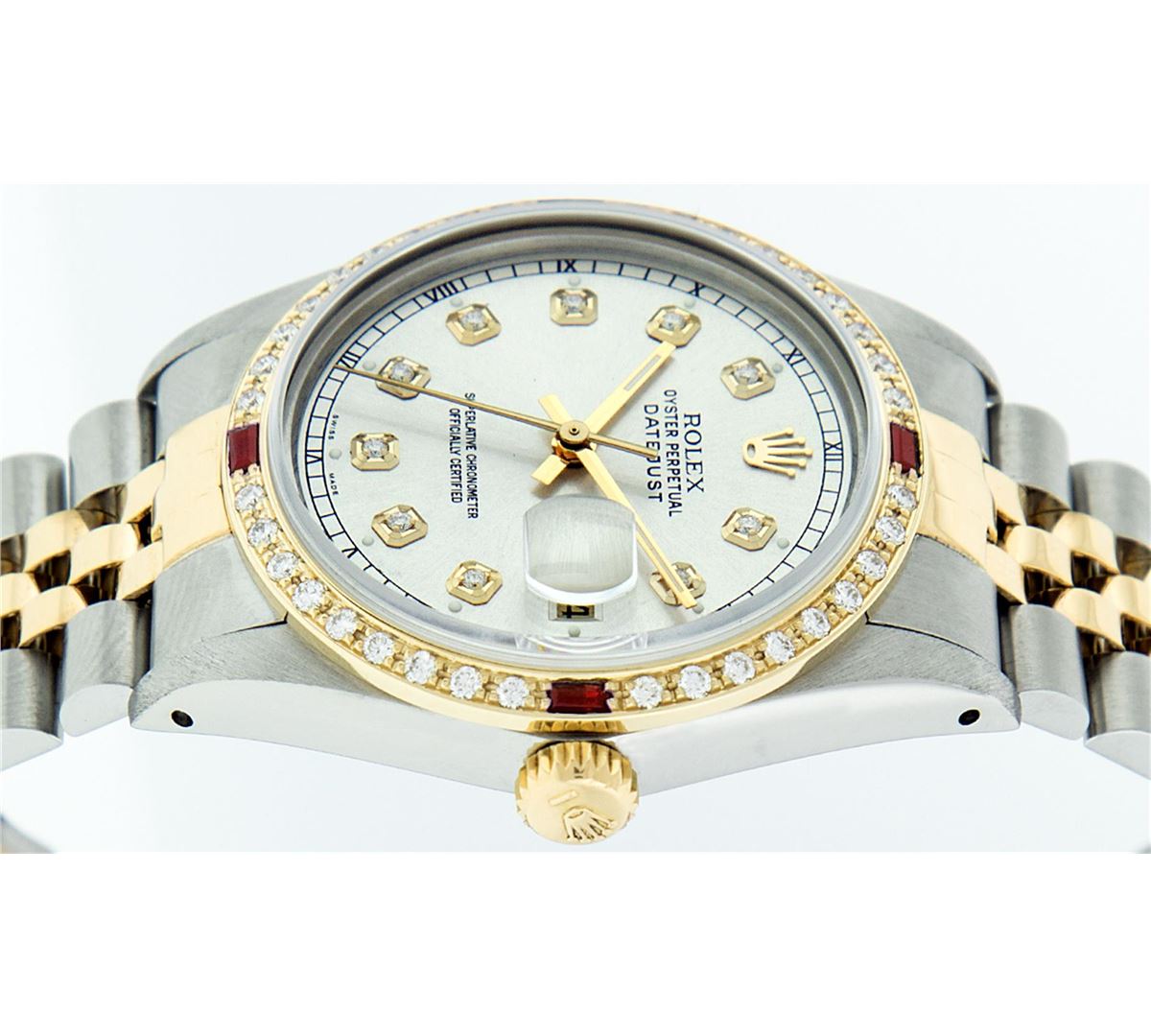 One Gents Two Tone Rolex Datejust Polished, Fully Serviced & Electronically Tested, 14K Yellow Gold & Stainless Steel Case:36mm, 14K Yellow Gold Crown, Custom Bezel: 18K Yellow Gold Ruby Beadset Diamond Bezel, Diamond Count: 36 Diamonds + 4 Rubies, Total Weight 1.0 Carat, Clarity: Si-VS, Color: G to H. Custom Crystal: Synthetic Sapphire Cyclops Lens. Movement: Automatic Winding Movement Caliber 3035. Custom Dial: Silver Diamond Dial With Square Roman Track and Luminescent Dots , Diamond Count: 10 Diamonds In Dial, Color: G to H, Clarity: SI-VS. Date Window: 3 O'Clock Position Date Display, Quickset, Model: Datejust Condition: G-6 Extra Fine. Bracelet: Two Tone 14K Yellow Gold & Stainless Steel Jubilee. Bright Polish. 7.0 Inch Length, Adjustable. Standard Clasp, With Rolex Logo. Comes with 6 month warranty.