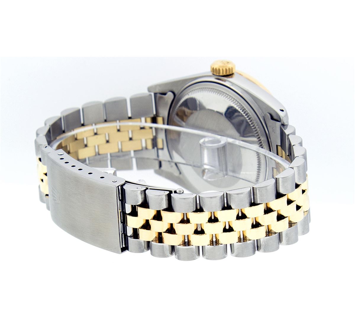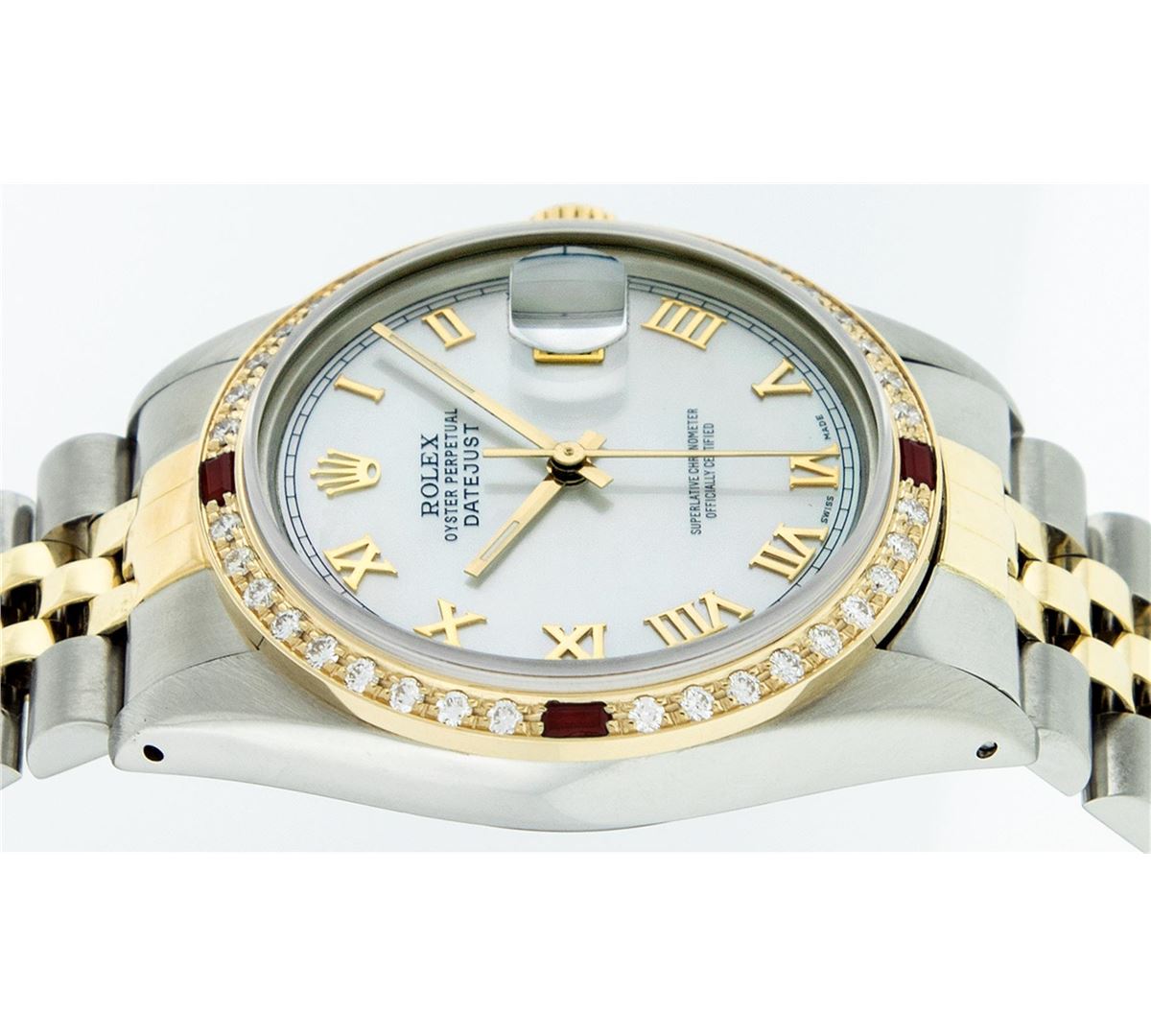 One Mens Two Tone Rolex Datejust Polished, Serviced & Electronically Tested, 14K Yellow Gold & Stainless Steel Case:36mm, 14K Yellow Gold Crown, Custom Bezel: 18K Yellow Gold Ruby Beadset Diamond Bezel, Diamond Count: 36 Diamonds + 4 Ruby, Total Weight 1.00 Carat, Clarity: Si-VS, Color: G to H. Custom Crystal: Synthetic Sapphire Cyclops Lens. Movement: Automatic Winding Movement Caliber 3035. Custom Dial: Mother Of Pearl Roman Dial. Date Window: 3 O'Clock Position Date Display, Quickset, Model: 16013 Condition: G-6 Extra Fine. Bracelet: Two Tone 14K Yellow Gold & Stainless Steel Jubilee. Bright Polish. 7.0 Inch Length, Adjustable. Standard Clasp, With Rolex Logo. Comes with 6 month warranty.