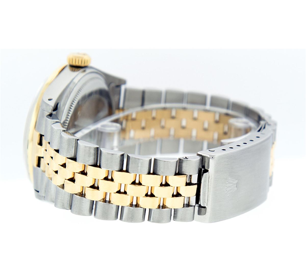 One Gents Two Tone Rolex Datejust Polished, Fully Serviced & Electronically Tested, 14K Yellow Gold & Stainless Steel Case:36mm, 14K Yellow Gold Crown, Custom Bezel: 18K Yellow Gold Ruby Beadset Diamond Bezel, Diamond Count: 36 Diamonds + 4 Rubies, Total Weight 1.0 Carat, Clarity: Si-VS, Color: G to H. Custom Crystal: Synthetic Sapphire Cyclops Lens. Movement: Automatic Winding Movement Caliber 3035. Custom Dial: Silver Diamond Dial With Square Roman Track and Luminescent Dots , Diamond Count: 10 Diamonds In Dial, Color: G to H, Clarity: SI-VS. Date Window: 3 O'Clock Position Date Display, Quickset, Model: Datejust Condition: G-6 Extra Fine. Bracelet: Two Tone 14K Yellow Gold & Stainless Steel Jubilee. Bright Polish. 7.0 Inch Length, Adjustable. Standard Clasp, With Rolex Logo. Comes with 6 month warranty.