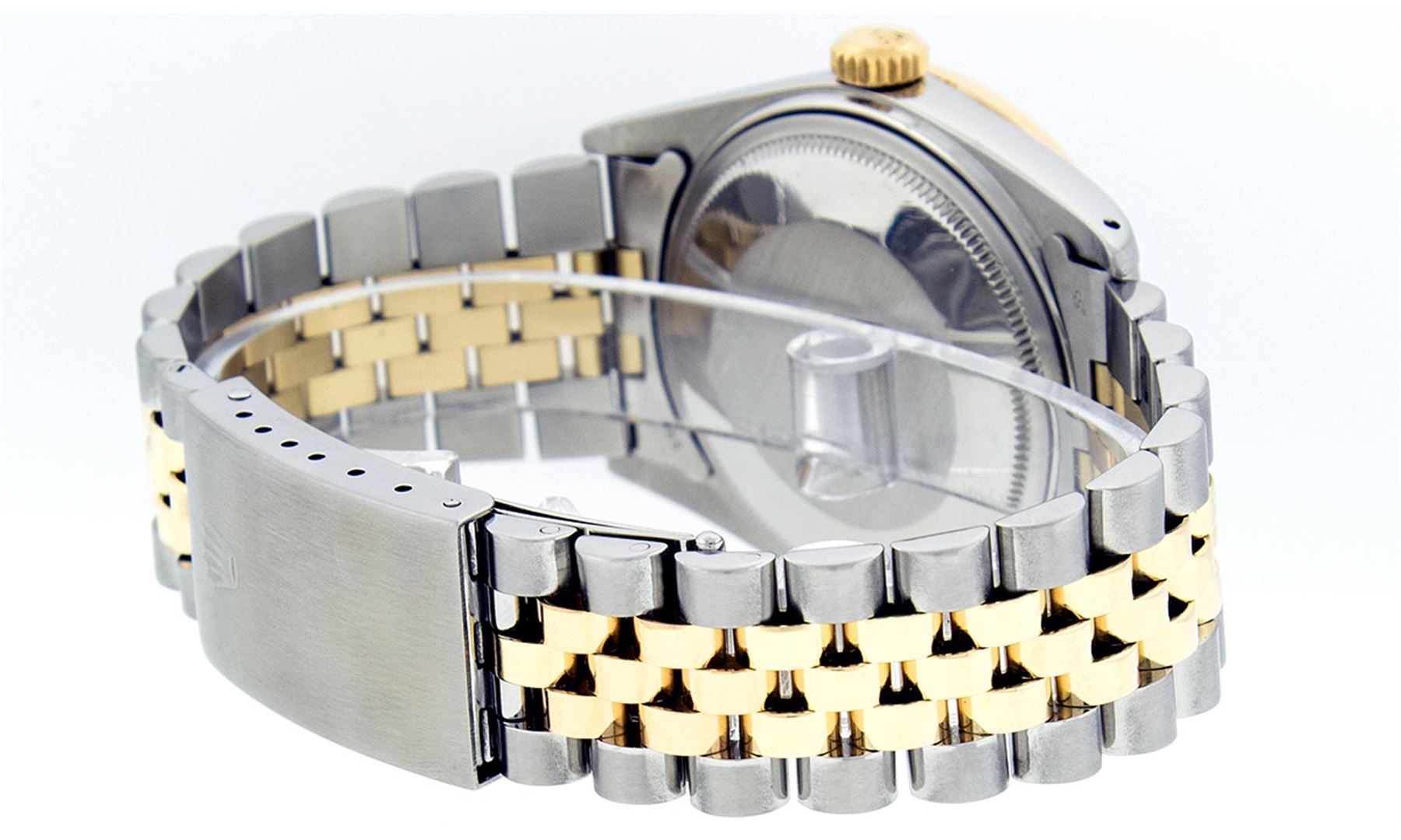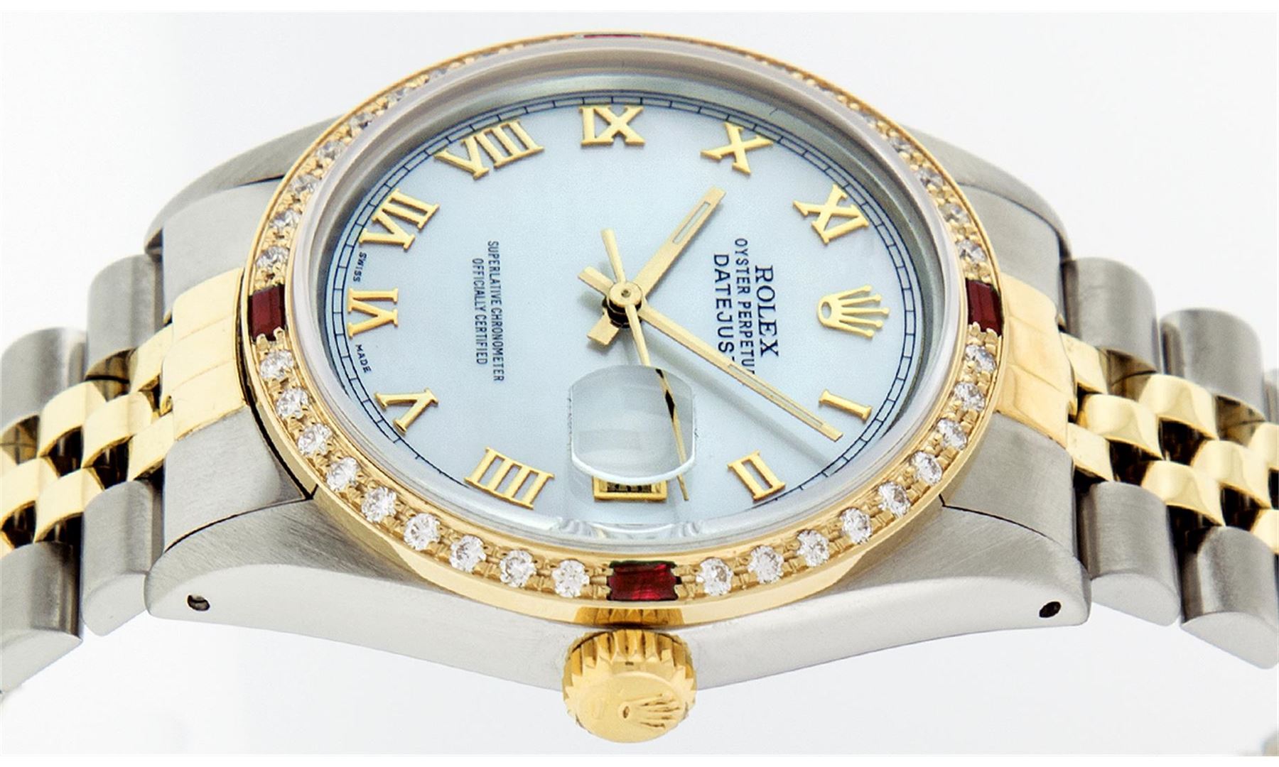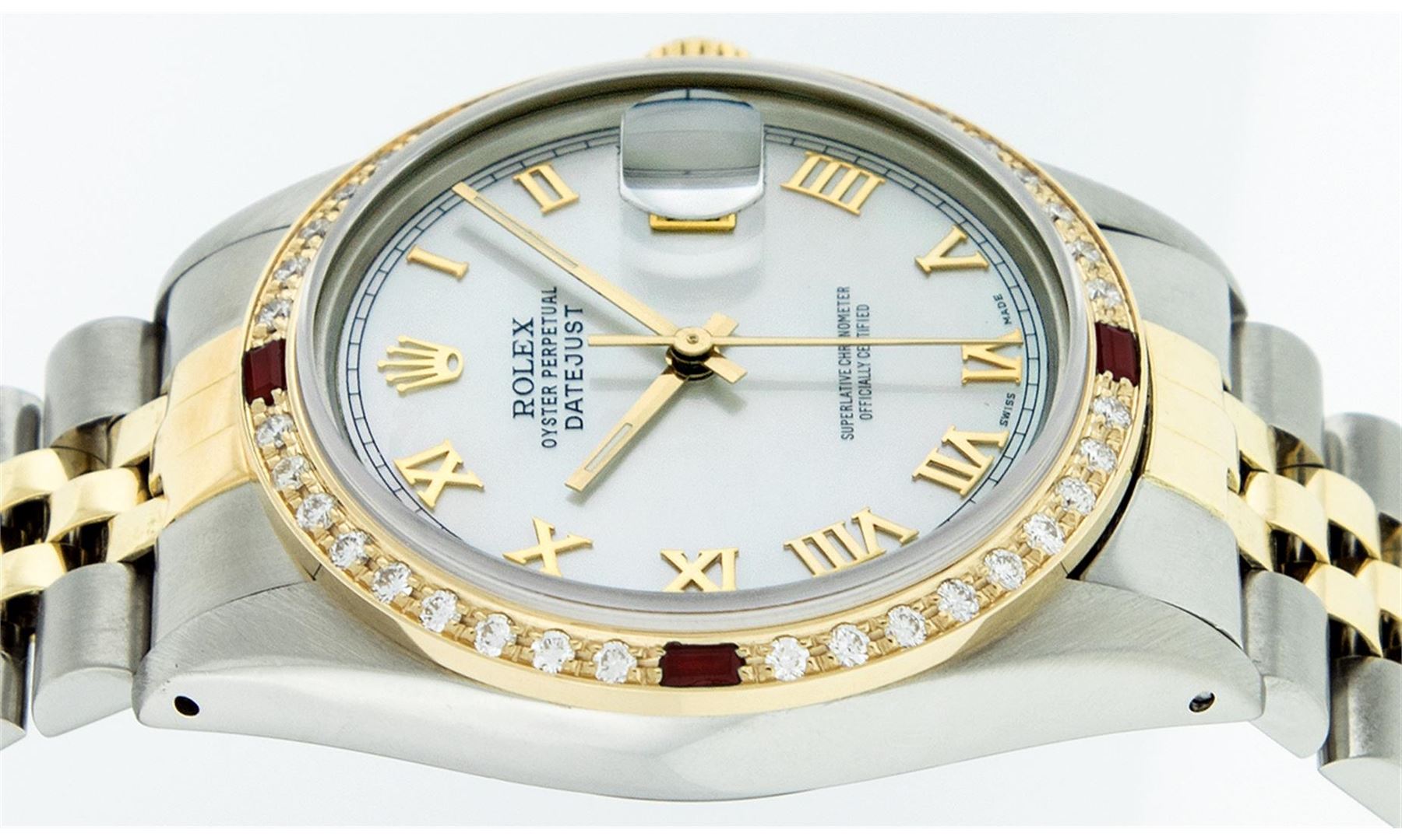 One Mens Two Tone Rolex Datejust Polished, Serviced & Electronically Tested, 14K Yellow Gold & Stainless Steel Case:36mm, 14K Yellow Gold Crown, Custom Bezel: 18K Yellow Gold Ruby Beadset Diamond Bezel, Diamond Count: 36 Diamonds + 4 Ruby, Total Weight 1.00 Carat, Clarity: Si-VS, Color: G to H. Custom Crystal: Synthetic Sapphire Cyclops Lens. Movement: Automatic Winding Movement Caliber 3035. Custom Dial: Mother Of Pearl Roman Dial. Date Window: 3 O'Clock Position Date Display, Quickset, Model: 16013 Condition: G-6 Extra Fine. Bracelet: Two Tone 14K Yellow Gold & Stainless Steel Jubilee. Bright Polish. 7.0 Inch Length, Adjustable. Standard Clasp, With Rolex Logo. Comes with 6 month warranty.