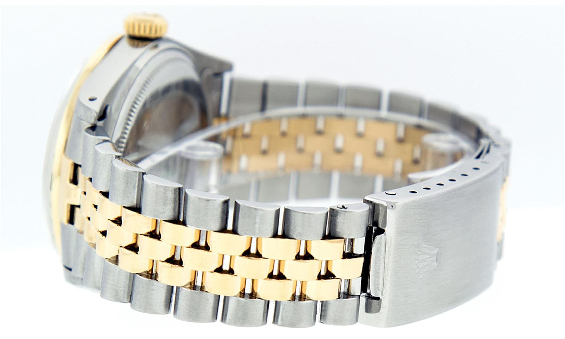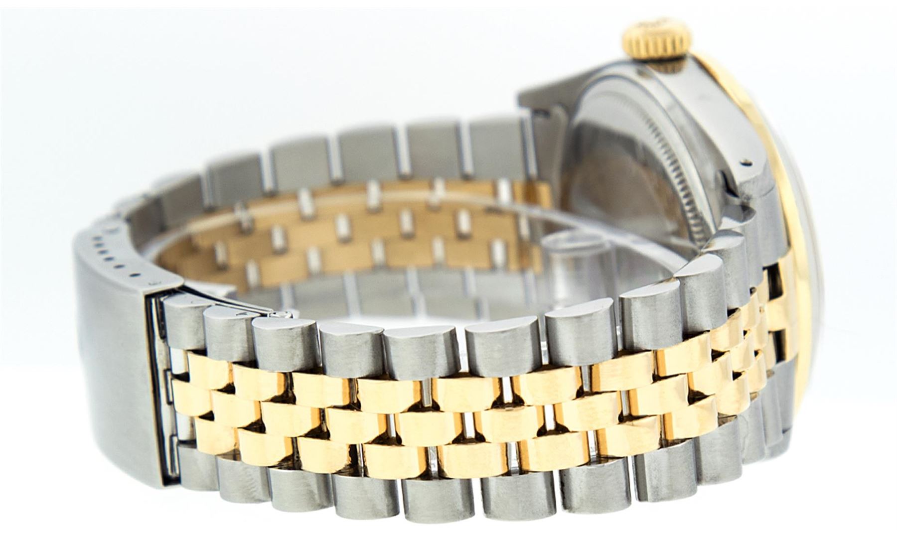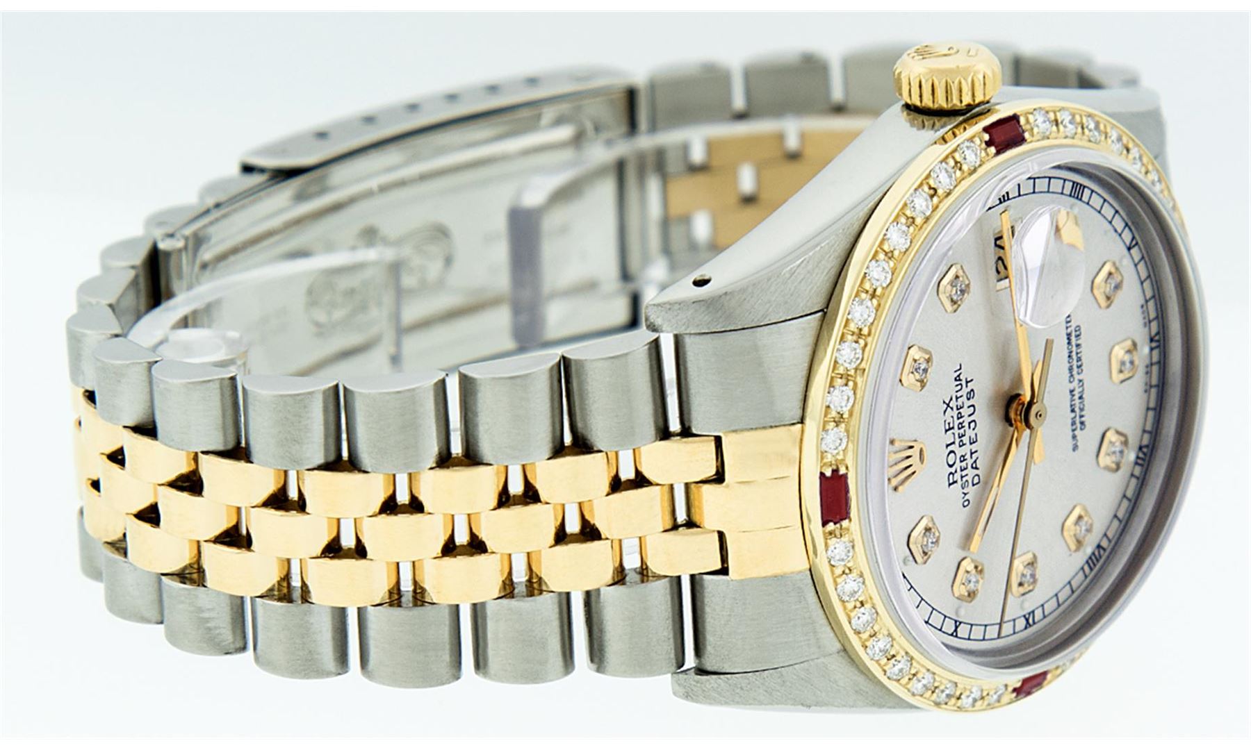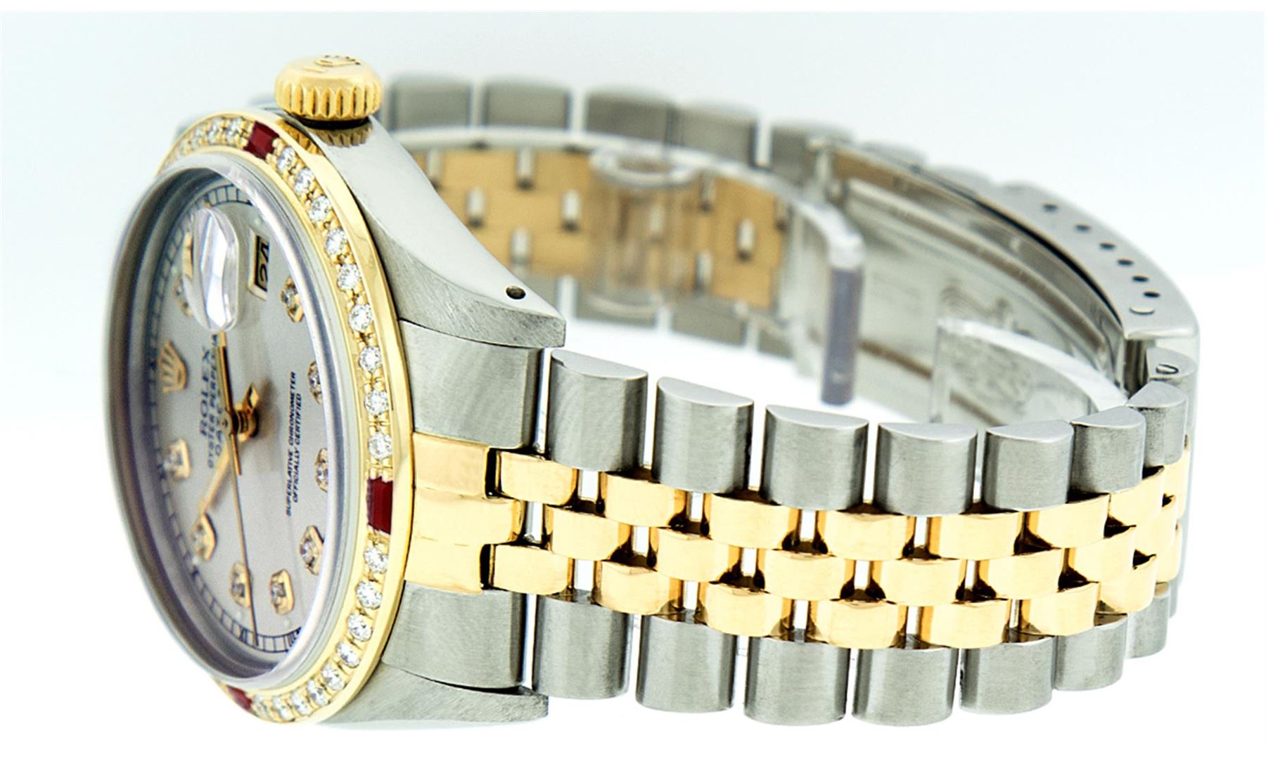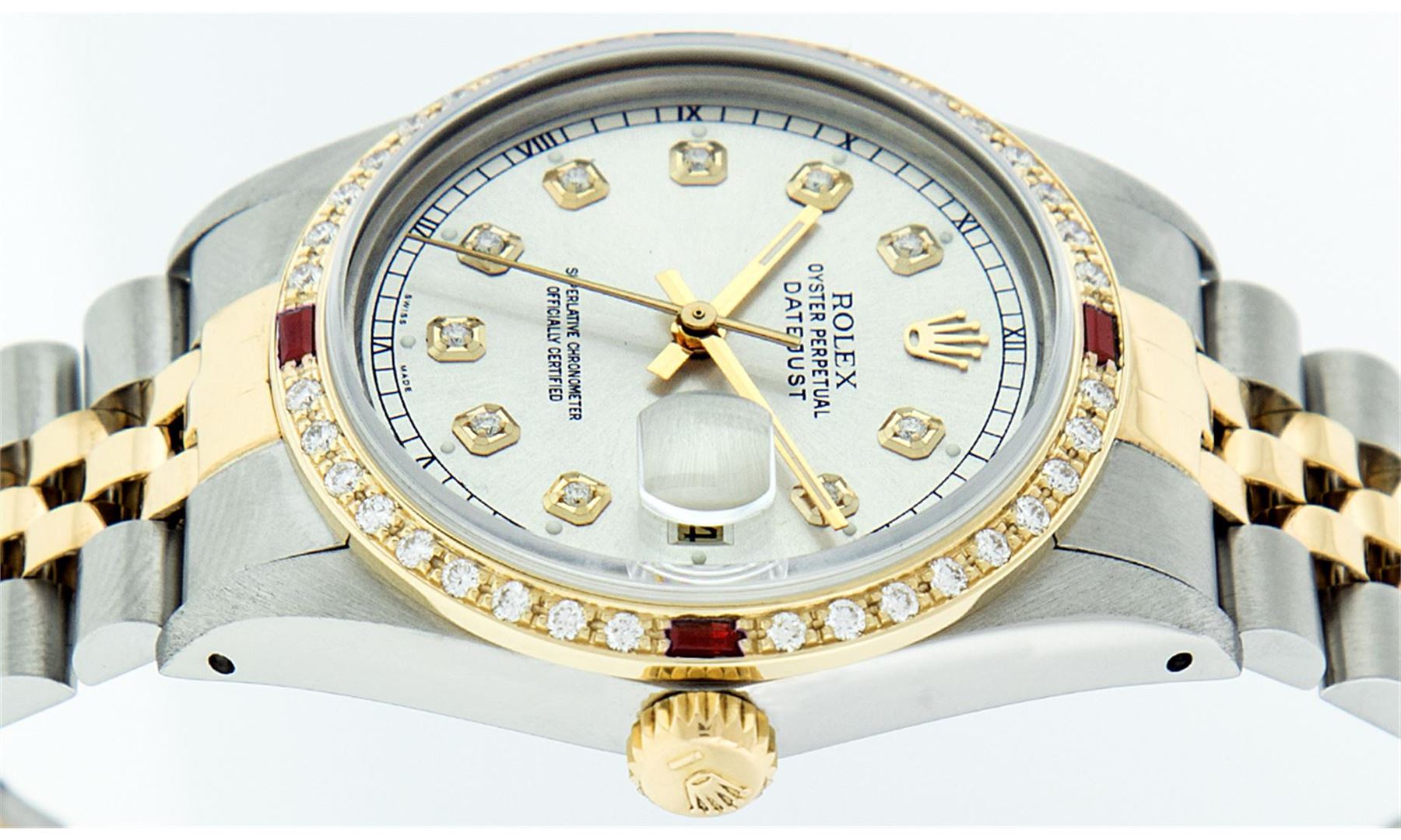 One Gents Two Tone Rolex Datejust Polished, Fully Serviced & Electronically Tested, 14K Yellow Gold & Stainless Steel Case:36mm, 14K Yellow Gold Crown, Custom Bezel: 18K Yellow Gold Ruby Beadset Diamond Bezel, Diamond Count: 36 Diamonds + 4 Rubies, Total Weight 1.0 Carat, Clarity: Si-VS, Color: G to H. Custom Crystal: Synthetic Sapphire Cyclops Lens. Movement: Automatic Winding Movement Caliber 3035. Custom Dial: Silver Diamond Dial With Square Roman Track and Luminescent Dots , Diamond Count: 10 Diamonds In Dial, Color: G to H, Clarity: SI-VS. Date Window: 3 O'Clock Position Date Display, Quickset, Model: Datejust Condition: G-6 Extra Fine. Bracelet: Two Tone 14K Yellow Gold & Stainless Steel Jubilee. Bright Polish. 7.0 Inch Length, Adjustable. Standard Clasp, With Rolex Logo. Comes with 6 month warranty.