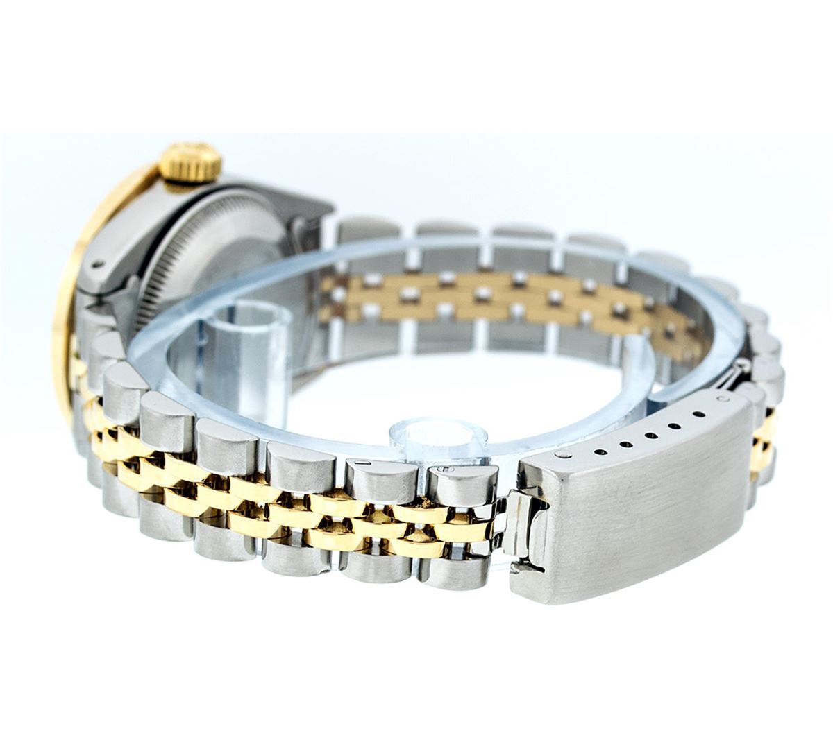 One Ladies Two Tone Rolex Datejust Polished, Serviced & Electronically Tested, 14K Yellow Gold & Stainless Steel Case:26mm, 14K Yellow Gold Crown, Custom Bezel: 18K Yellow Gold Sapphire Channel Set Diamond Bezel, Diamond + Gem Count: 36 Diamonds + 4 Sapphires. Total Weight 1.00 Carat, Clarity: Si-VS, Color: G to H. Custom Crystal: Synthetic Sapphire Cyclops Lens. Movement: Automatic Winding Movement Caliber 2030. Custom Dial: Mother Of Pearl with Ruby Hour Markers, Stone Count:10 Rubies In Dial. Date Window: 3 O'Clock Position Date Display, Model: Datejust, Condition: G-6 Extra Fine. Bracelet: Two Tone 14K Yellow Gold & Stainless Steel Jubilee. Bright Polish. 6.0 Inch Length, Adjustable. Standard Clasp, With Rolex Logo. Comes with 6 month warranty.