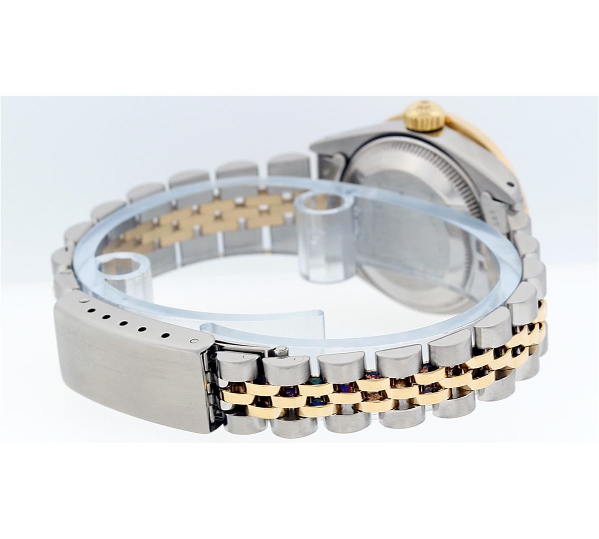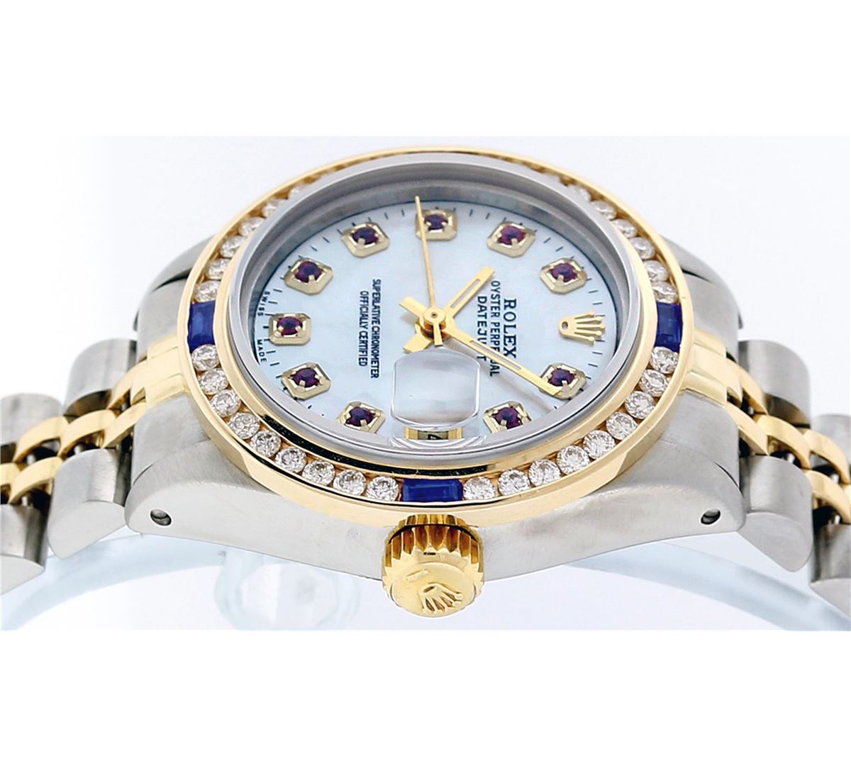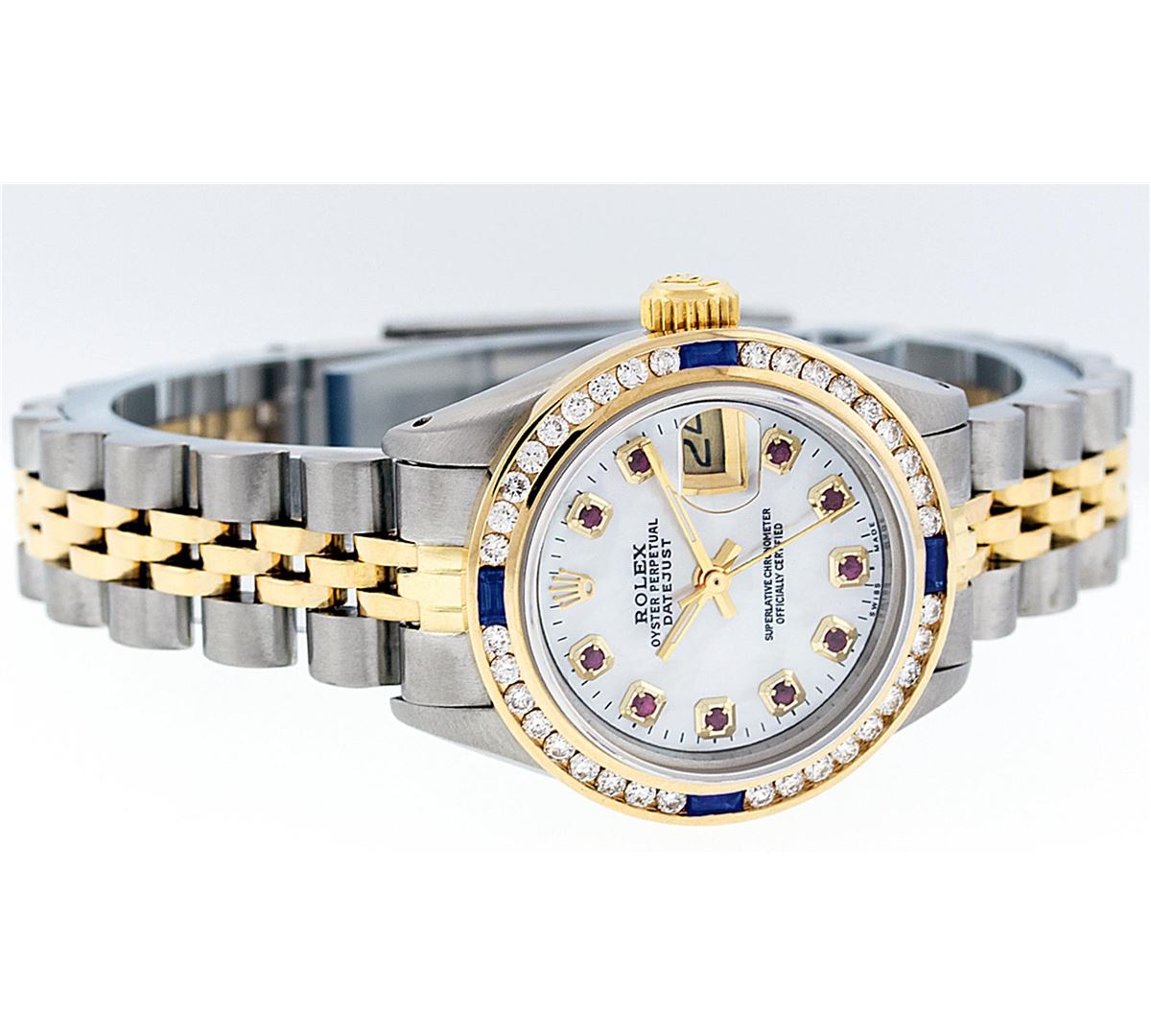 One Ladies Two Tone Rolex Datejust Polished, Serviced & Electronically Tested, 14K Yellow Gold & Stainless Steel Case:26mm, 14K Yellow Gold Crown, Custom Bezel: 18K Yellow Gold Sapphire Channel Set Diamond Bezel, Diamond + Gem Count: 36 Diamonds + 4 Sapphires. Total Weight 1.00 Carat, Clarity: Si-VS, Color: G to H. Custom Crystal: Synthetic Sapphire Cyclops Lens. Movement: Automatic Winding Movement Caliber 2030. Custom Dial: Mother Of Pearl with Ruby Hour Markers, Stone Count:10 Rubies In Dial. Date Window: 3 O'Clock Position Date Display, Model: Datejust, Condition: G-6 Extra Fine. Bracelet: Two Tone 14K Yellow Gold & Stainless Steel Jubilee. Bright Polish. 6.0 Inch Length, Adjustable. Standard Clasp, With Rolex Logo. Comes with 6 month warranty.