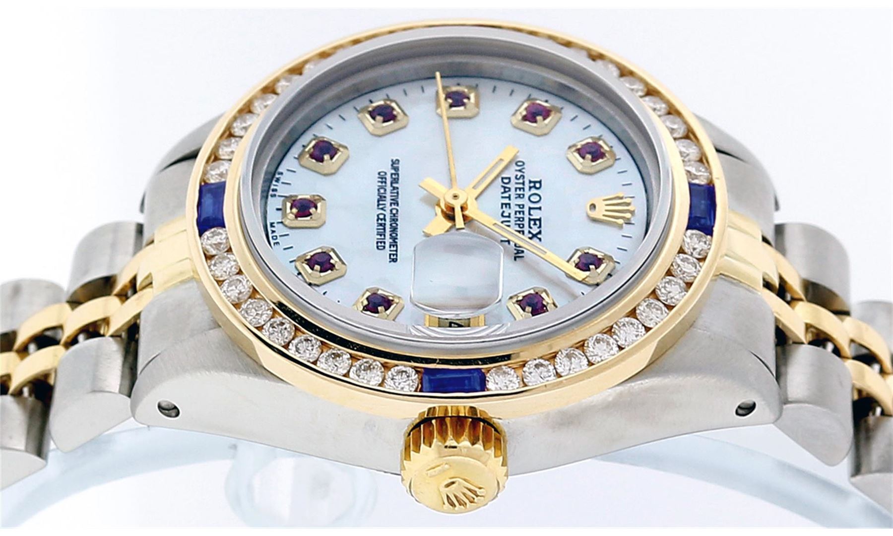 One Ladies Two Tone Rolex Datejust Polished, Serviced & Electronically Tested, 14K Yellow Gold & Stainless Steel Case:26mm, 14K Yellow Gold Crown, Custom Bezel: 18K Yellow Gold Sapphire Channel Set Diamond Bezel, Diamond + Gem Count: 36 Diamonds + 4 Sapphires. Total Weight 1.00 Carat, Clarity: Si-VS, Color: G to H. Custom Crystal: Synthetic Sapphire Cyclops Lens. Movement: Automatic Winding Movement Caliber 2030. Custom Dial: Mother Of Pearl with Ruby Hour Markers, Stone Count:10 Rubies In Dial. Date Window: 3 O'Clock Position Date Display, Model: Datejust, Condition: G-6 Extra Fine. Bracelet: Two Tone 14K Yellow Gold & Stainless Steel Jubilee. Bright Polish. 6.0 Inch Length, Adjustable. Standard Clasp, With Rolex Logo. Comes with 6 month warranty.