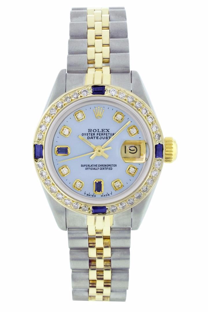 One Ladies Two Tone Rolex Datejust Polished, Serviced & Electronically Tested, 14K Yellow Gold & Stainless Steel Case:26mm, 14K Yellow Gold Crown, Custom Bezel: 18K Yellow Gold Sapphire Beadset Diamond Bezel, Diamond Count: 28 Diamonds + 4 Sapphires, Total Weight .70 Carat, Clarity: Si-VS, Color: G to H. Custom Crystal: Synthetic Sapphire Cyclops Lens. Movement: Automatic Winding Movement Caliber 2030. Custom Dial: Blue Mother Of Pearl Sapphires + Diamond Dial, Diamond Count: 8 Diamonds + 2 Sapphires, Clarity: SI-VS, Color: G to H. Date Window: 3 O'Clock Position Date Display, Non Quickset, Model: 6917 Condition: G-6 Extra Fine. Bracelet: Two Tone 14K Yellow Gold & Stainless Steel Jubilee. Bright Polish. 5.5 Inch Length, Adjustable. Standard Clasp, With Rolex Logo.