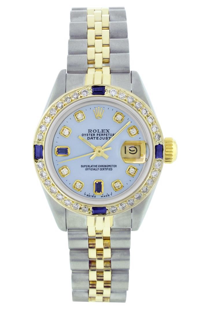 One Ladies Two Tone Rolex Datejust Polished, Serviced & Electronically Tested, 14K Yellow Gold & Stainless Steel Case:26mm, 14K Yellow Gold Crown, Custom Bezel: 18K Yellow Gold Sapphire Beadset Diamond Bezel, Diamond Count: 28 Diamonds + 4 Sapphires, Total Weight .70 Carat, Clarity: Si-VS, Color: G to H. Custom Crystal: Synthetic Sapphire Cyclops Lens. Movement: Automatic Winding Movement Caliber 2030. Custom Dial: Blue Mother Of Pearl 8 Diamond Plus 2 Sapphire Baguettes, Diamond Count: 8 Diamonds + 2 Sapphires, Clarity: SI-VS, Color: G to H. Date Window: 3 O'Clock Position Date Display, Non Quickset, Model: 6917 Condition: G-6 Extra Fine. Bracelet: Two Tone 14K Yellow Gold & Stainless Steel Jubilee. Bright Polish. 5.5 Inch Length, Adjustable. Standard Clasp, With Rolex Logo.