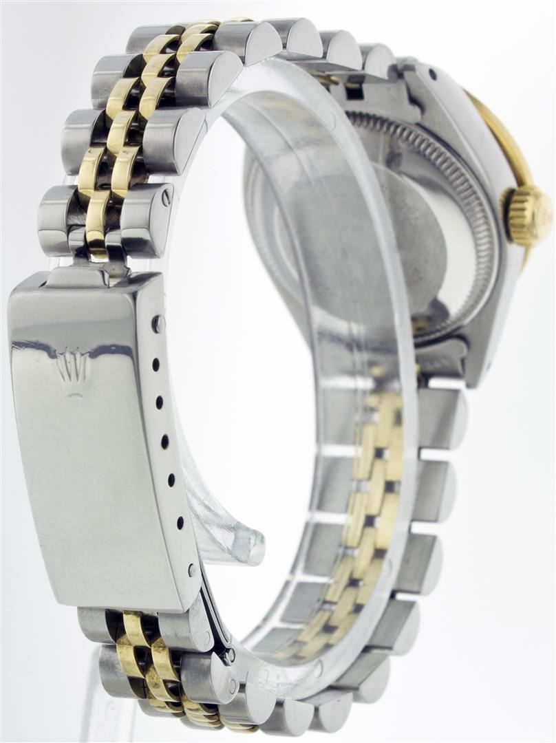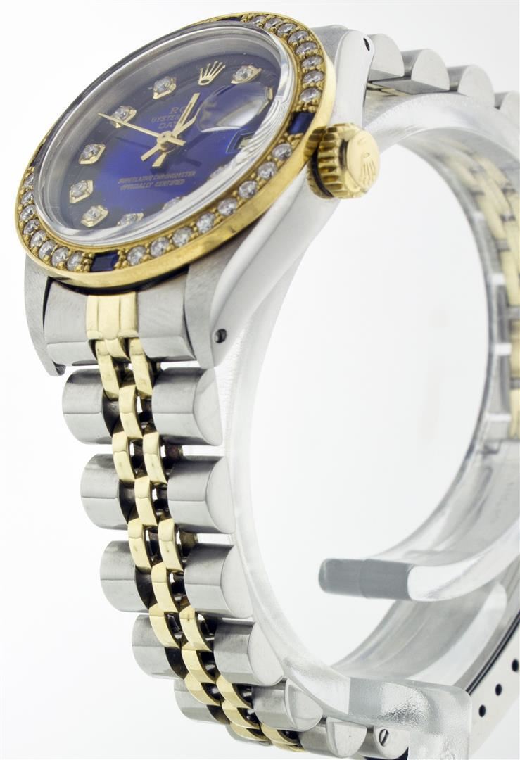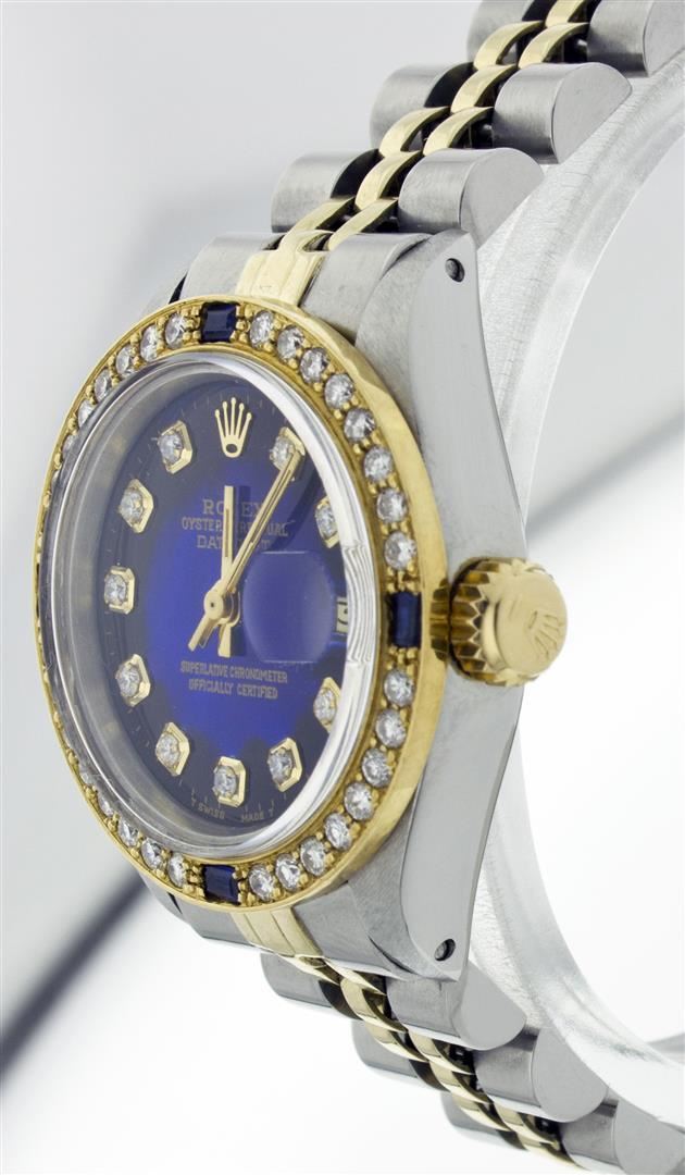 One Ladies Two Tone Rolex Datejust Polished, Serviced & Electronically Tested, 14K Yellow Gold & Stainless Steel Case:26mm, 14K Yellow Gold Crown, Custom Bezel: 18K Yellow Gold Sapphire Beadset Diamond Bezel, Diamond Count: 28 Diamonds + 4 Sapphires, Total Weight .70 Carat, Clarity: Si-VS, Color: G to H. Custom Crystal: Synthetic Sapphire Cyclops Lens. Movement: Automatic Winding Movement Caliber 2030. Custom Dial: Blue Vignette With Diamond Hour Markers, Diamond Count: 10 Diamonds, Clarity: SI-VS, Color: G to H. Date Window: 3 O'Clock Position Date Display, Non Quickset, Model: 6917 Condition: G-6 Extra Fine. Bracelet: Two Tone 14K Yellow Gold & Stainless Steel Jubilee. Bright Polish. 5.5 Inch Length, Adjustable. Standard Clasp, With Rolex Logo.