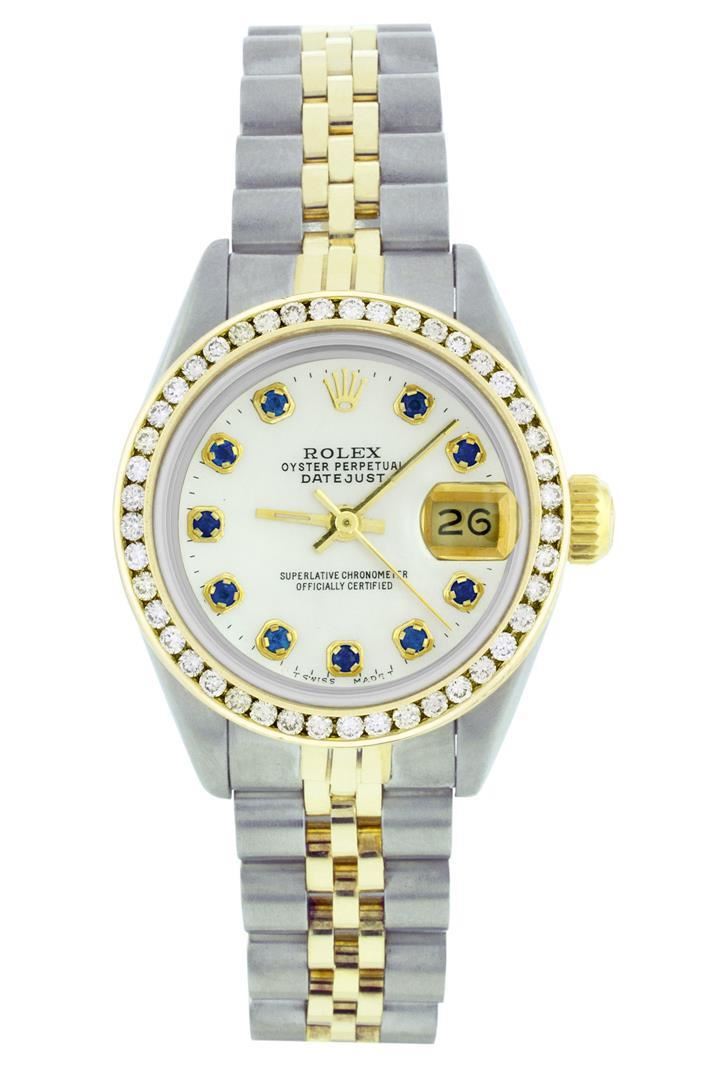 One Ladies Two Tone Rolex Datejust Polished, Serviced & Electronically Tested, 14K Yellow Gold & Stainless Steel Case:26mm, 14K Yellow Gold Crown, Custom Bezel: 18K Yellow Gold Channel Set Diamond Bezel, Diamond Count: 44 Diamonds Total Weight 1.00 Carat, Clarity: Si-VS, Color: G to H. Custom Crystal: Synthetic Sapphire Cyclops Lens. Movement: Automatic Winding Movement Caliber 2030. Custom Dial: Mother Of Pearl With Sapphire Hour Markers, Stone Count: 10 Sapphires. Date Window: 3 O'Clock Position Date Display, Non Quickset, Model: 6917 Condition: G-6 Extra Fine. Bracelet: Two Tone 14K Yellow Gold & Stainless Steel Jubilee. Bright Polish. 5.5 Inch Length, Adjustable. Standard Clasp, With Rolex Logo.