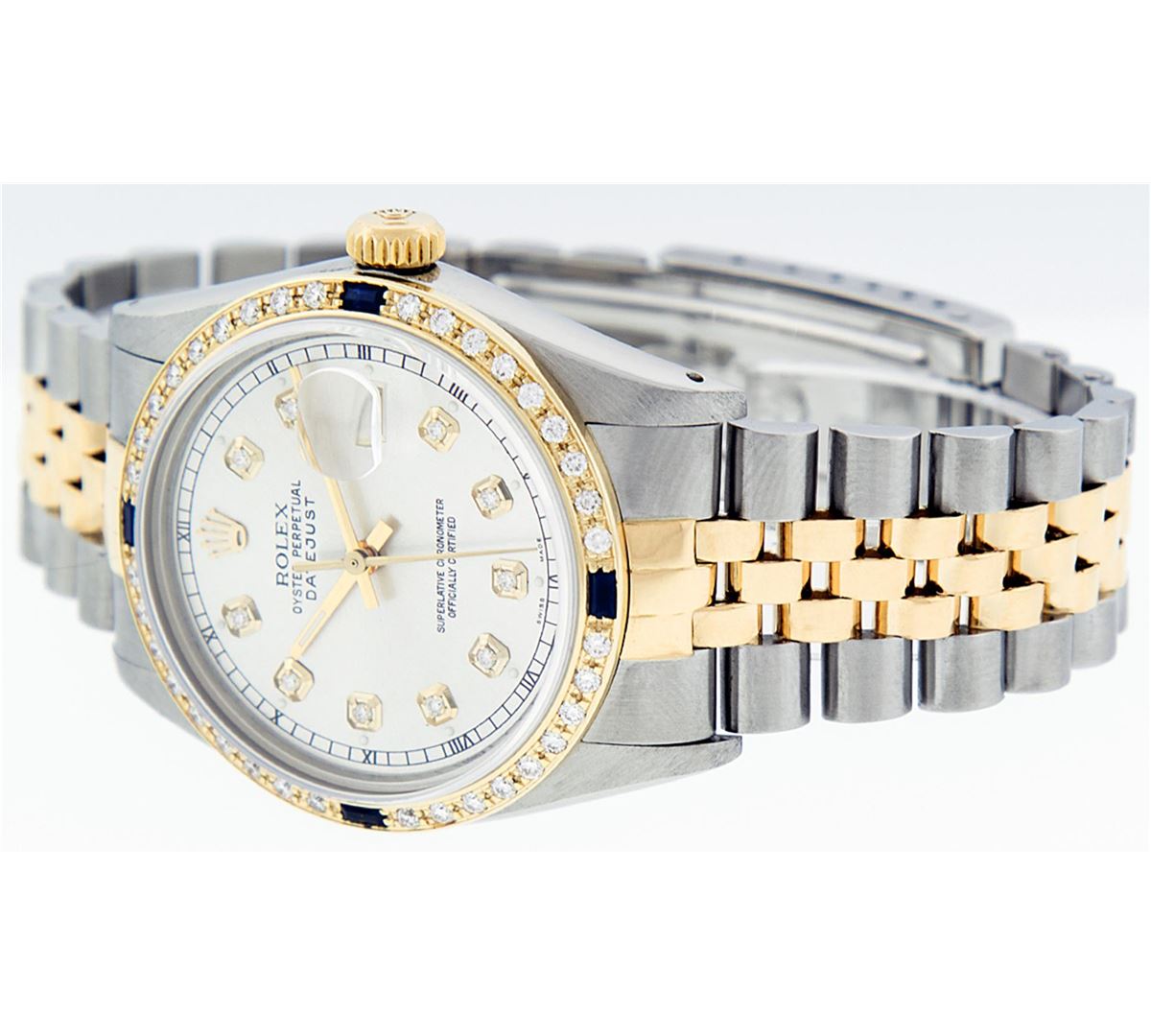 One Gents Two Tone Rolex Datejust Polished, Fully Serviced & Electronically Tested, 14K Yellow Gold & Stainless Steel Case:36mm, 14K Yellow Gold Crown, Custom Bezel: 18K Yellow Gold Sapphire Beadset Diamond Bezel, Diamond Count: 36 Diamonds + 4 Sapphires, Total Weight 1.0 Carat, Clarity: Si-VS, Color: G to H. Custom Crystal: Synthetic Sapphire Cyclops Lens. Movement: Automatic Winding Movement Caliber 3035. Custom Dial: Silver Diamond Dial With Square Track and Luminescent Dots. Diamond Count: 10 Diamonds In Dial, Color: G to H, Clarity: SI-VS. Date Window: 3 O'Clock Position Date Display, Quickset, Model: Datejust Condition: G-6 Extra Fine. Bracelet: Two Tone 14K Yellow Gold & Stainless Steel Jubilee. Bright Polish. 7.0 Inch Length, Adjustable. Standard Clasp, With Rolex Logo. Comes with 6 month warranty.