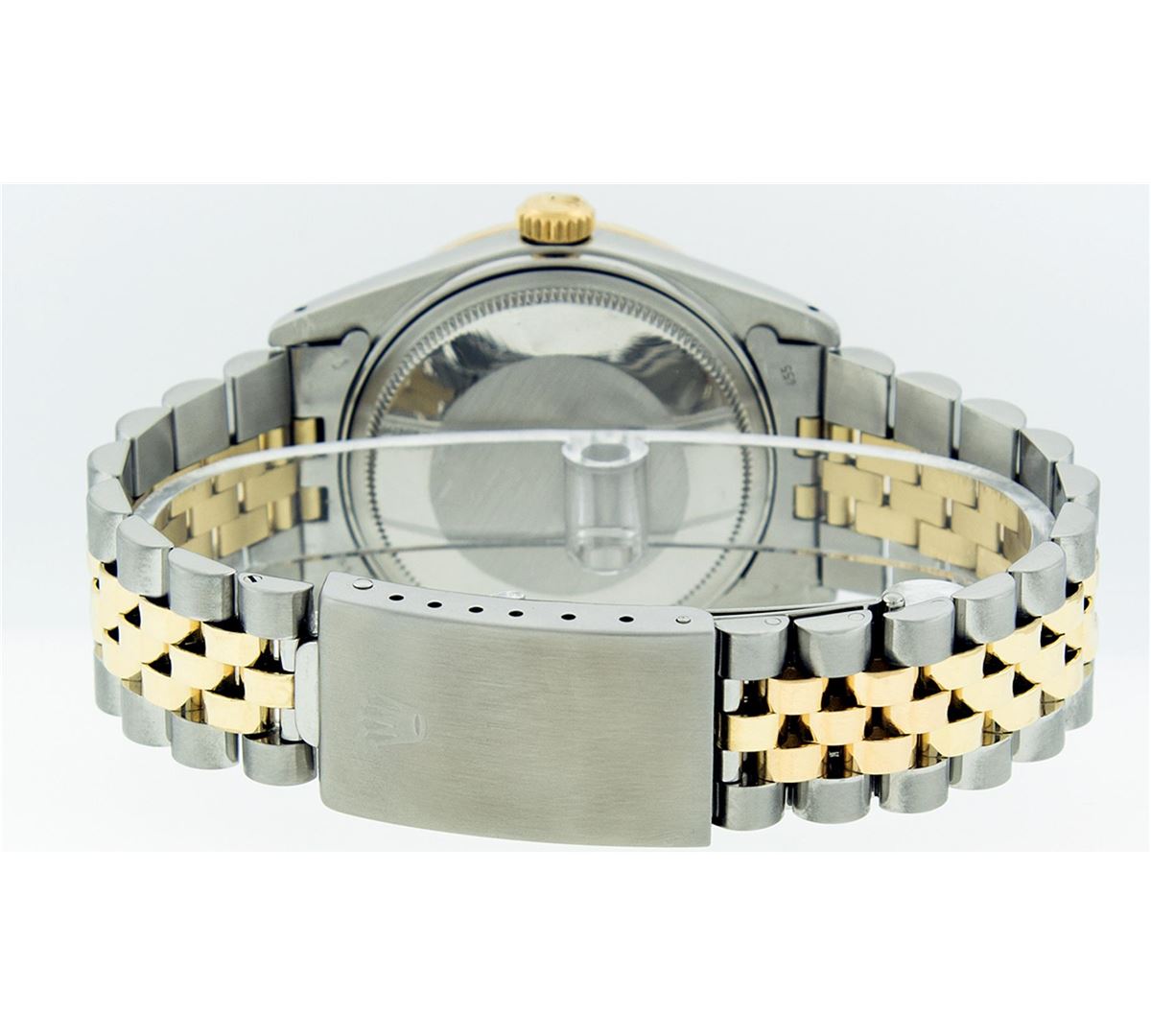 One Mens Two Tone Rolex Datejust Polished, Serviced & Electronically Tested, 14K Yellow Gold & Stainless Steel Case:36mm, 14K Yellow Gold Crown, Custom Bezel: 18K Yellow Gold Sapphire Beadset Diamond Bezel, Diamond Count: 36 Diamonds + 4 Sapphires, Total Weight 1.00 Carat, Clarity: Si-VS, Color: G to H. Custom Crystal: Synthetic Sapphire Cyclops Lens. Movement: Automatic Winding Movement Caliber 3035. Custom Dial: Mother Of Pearl Roman Dial. Date Window: 3 O'Clock Position Date Display, Quickset, Model: 16013 Condition: G-6 Extra Fine. Bracelet: Two Tone 14K Yellow Gold & Stainless Steel Jubilee. Bright Polish. 7.0 Inch Length, Adjustable. Standard Clasp, With Rolex Logo. Comes with 6 month warranty.