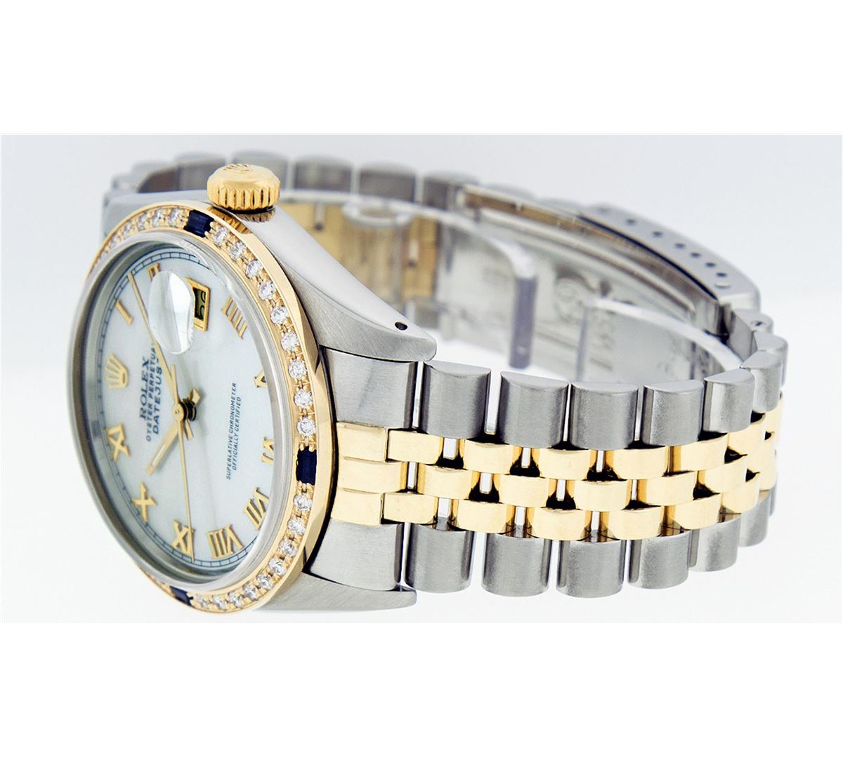 One Mens Two Tone Rolex Datejust Polished, Serviced & Electronically Tested, 14K Yellow Gold & Stainless Steel Case:36mm, 14K Yellow Gold Crown, Custom Bezel: 18K Yellow Gold Sapphire Beadset Diamond Bezel, Diamond Count: 36 Diamonds + 4 Sapphires, Total Weight 1.00 Carat, Clarity: Si-VS, Color: G to H. Custom Crystal: Synthetic Sapphire Cyclops Lens. Movement: Automatic Winding Movement Caliber 3035. Custom Dial: Mother Of Pearl Roman Dial. Date Window: 3 O'Clock Position Date Display, Quickset, Model: 16013 Condition: G-6 Extra Fine. Bracelet: Two Tone 14K Yellow Gold & Stainless Steel Jubilee. Bright Polish. 7.0 Inch Length, Adjustable. Standard Clasp, With Rolex Logo. Comes with 6 month warranty.
