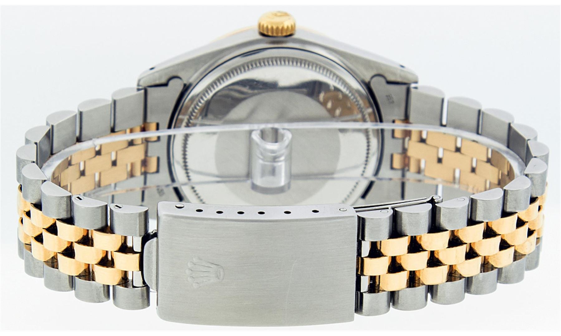 One Mens Two Tone Rolex Datejust Polished, Serviced & Electronically Tested, 14K Yellow Gold & Stainless Steel Case:36mm, 14K Yellow Gold Crown, Custom Bezel: 18K Yellow Gold Beadset Diamond Bezel, Diamond Count: 44 Diamonds Total Weight 1.00 Carat, Clarity: Si-VS, Color: G to H. Custom Crystal: Synthetic Sapphire Cyclops Lens. Movement: Automatic Winding Movement Caliber 3035. Custom Dial: Mother Of Pearl Dial Set With Diamond Hour Markers, 8 Diamonds + 2 Sapphire Baguettes in Dial G To H In Color, Date Window: 3 O'Clock Position Date Display, Quickset, Model: 16013 Condition: G-6 Extra Fine. Bracelet: Two Tone 14K Yellow Gold & Stainless Steel Jubilee. Bright Polish. 7.0 Inch Length, Adjustable. Standard Clasp, With Rolex Logo. Comes with 6 month warranty.