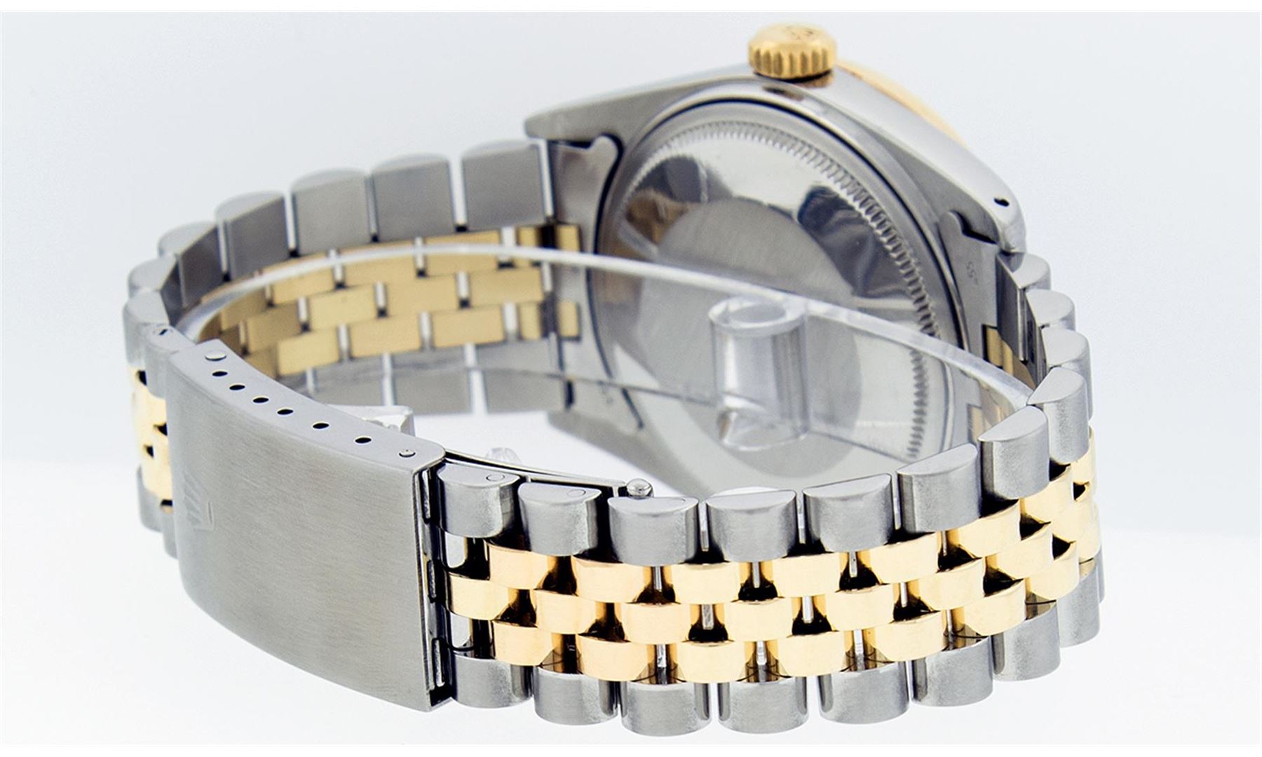 One Mens Two Tone Rolex Datejust Polished, Serviced & Electronically Tested, 14K Yellow Gold & Stainless Steel Case:36mm, 14K Yellow Gold Crown, Custom Bezel: 18K Yellow Gold Sapphire Beadset Diamond Bezel, Diamond Count: 36 Diamonds + 4 Sapphires, Total Weight 1.00 Carat, Clarity: Si-VS, Color: G to H. Custom Crystal: Synthetic Sapphire Cyclops Lens. Movement: Automatic Winding Movement Caliber 3035. Custom Dial: Mother Of Pearl Roman Dial. Date Window: 3 O'Clock Position Date Display, Quickset, Model: 16013 Condition: G-6 Extra Fine. Bracelet: Two Tone 14K Yellow Gold & Stainless Steel Jubilee. Bright Polish. 7.0 Inch Length, Adjustable. Standard Clasp, With Rolex Logo. Comes with 6 month warranty.
