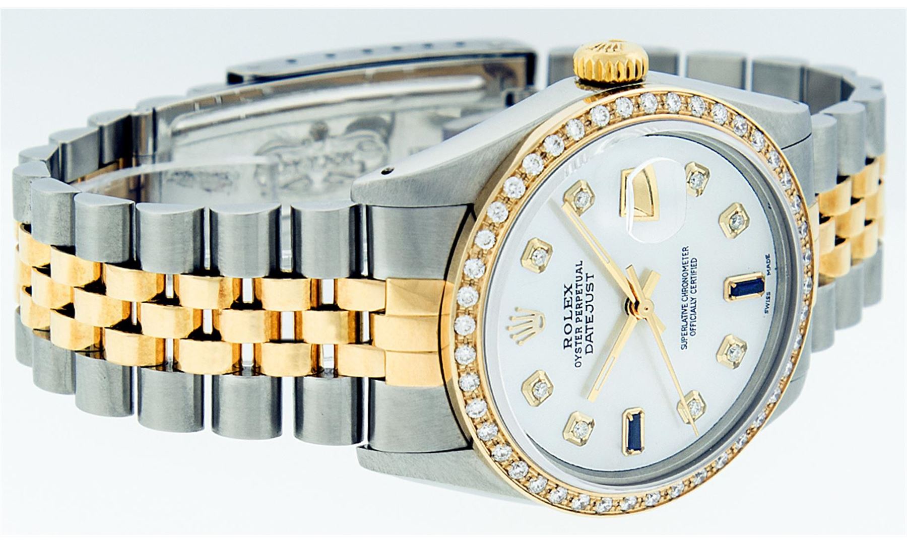 One Mens Two Tone Rolex Datejust Polished, Serviced & Electronically Tested, 14K Yellow Gold & Stainless Steel Case:36mm, 14K Yellow Gold Crown, Custom Bezel: 18K Yellow Gold Beadset Diamond Bezel, Diamond Count: 44 Diamonds Total Weight 1.00 Carat, Clarity: Si-VS, Color: G to H. Custom Crystal: Synthetic Sapphire Cyclops Lens. Movement: Automatic Winding Movement Caliber 3035. Custom Dial: Mother Of Pearl Dial Set With Diamond Hour Markers, 8 Diamonds + 2 Sapphire Baguettes in Dial G To H In Color, Date Window: 3 O'Clock Position Date Display, Quickset, Model: 16013 Condition: G-6 Extra Fine. Bracelet: Two Tone 14K Yellow Gold & Stainless Steel Jubilee. Bright Polish. 7.0 Inch Length, Adjustable. Standard Clasp, With Rolex Logo. Comes with 6 month warranty.