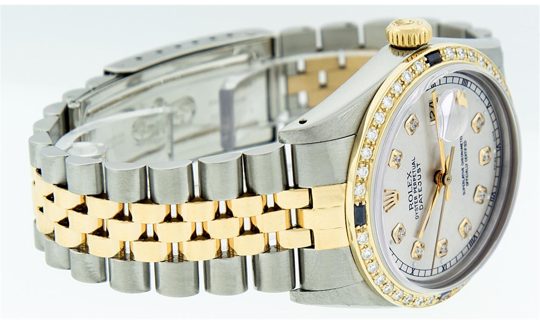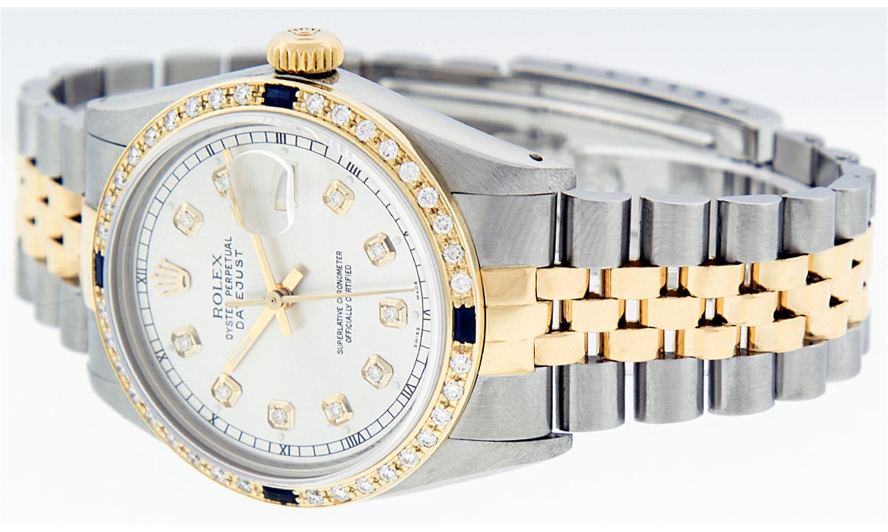 One Gents Two Tone Rolex Datejust Polished, Fully Serviced & Electronically Tested, 14K Yellow Gold & Stainless Steel Case:36mm, 14K Yellow Gold Crown, Custom Bezel: 18K Yellow Gold Sapphire Beadset Diamond Bezel, Diamond Count: 36 Diamonds + 4 Sapphires, Total Weight 1.0 Carat, Clarity: Si-VS, Color: G to H. Custom Crystal: Synthetic Sapphire Cyclops Lens. Movement: Automatic Winding Movement Caliber 3035. Custom Dial: Silver Diamond Dial With Square Track and Luminescent Dots. Diamond Count: 10 Diamonds In Dial, Color: G to H, Clarity: SI-VS. Date Window: 3 O'Clock Position Date Display, Quickset, Model: Datejust Condition: G-6 Extra Fine. Bracelet: Two Tone 14K Yellow Gold & Stainless Steel Jubilee. Bright Polish. 7.0 Inch Length, Adjustable. Standard Clasp, With Rolex Logo. Comes with 6 month warranty.