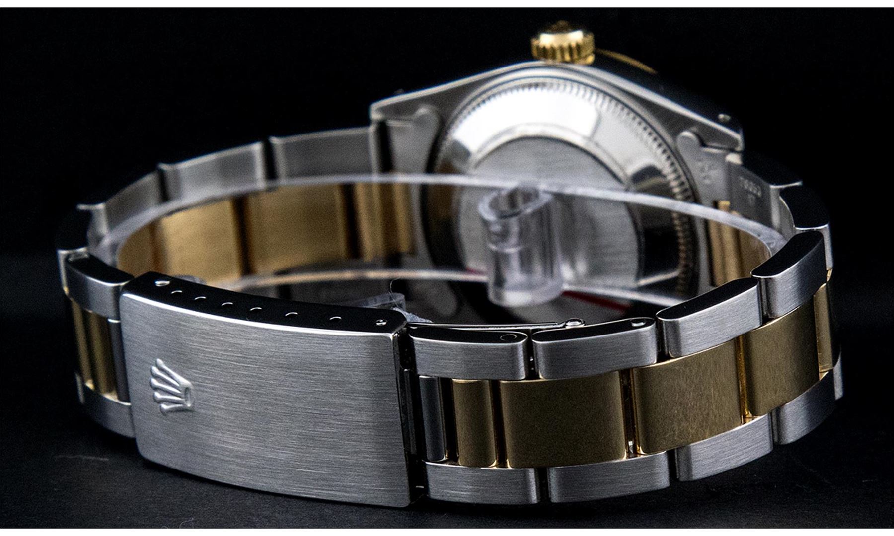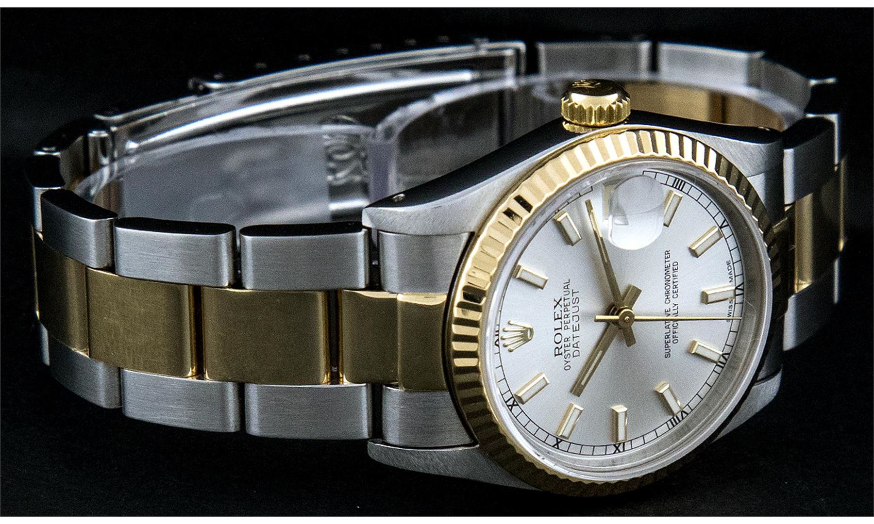 One Midsize Two Tone Rolex Datejust Polished, Serviced & Electronically Tested, Stainless Steel Case Case:31mm, Yellow Gold Crown, Bezel: Yellow Gold Fluted Bezel, Custom Crystal: Acrylic Cyclops Lens. Movement: Automatic Winding Movement Caliber 2135. Dial: Silver Index With Square Track. Date Window: 3 O'Clock Position Date Display, Quickset, Model: Midsize Datejust. Condition: G-6 Extra Fine. Bracelet: Two Tone Oyster Band. Bright Polish. 6.0 Inch Length, Adjustable. Standard Clasp, With Rolex Logo.