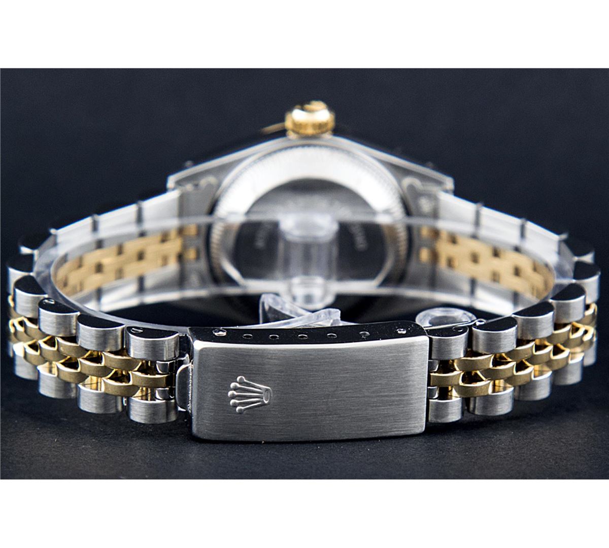 One Ladies Two Tone Rolex Datejust Polished, Serviced & Electronically Tested, 14K Yellow Gold & Stainless Steel Case:26mm, 14K Yellow Gold Crown, Bezel: 14K Yellow Gold Fluted Bezel. Custom Crystal: Acrylic Cyclops Lens. Movement: Automatic Winding Movement Caliber 2030. Custom Silver Stick Dial. Date Window: 3 O'Clock Position Date Display, Non Quickset, Model: 6917 Condition: G-6 Extra Fine. Bracelet: Two Tone 14K Yellow Gold & Stainless Steel Jubilee. Bright Polish. 5.5 Inch Length, Adjustable. Standard Clasp, With Rolex Logo.