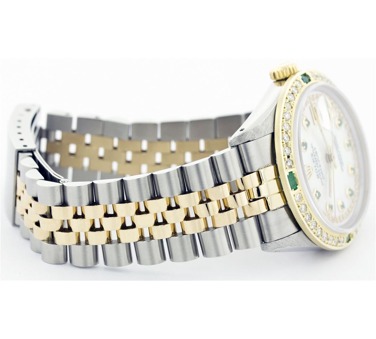 One Mens Two Tone Rolex Datejust Polished, Serviced & Electronically Tested, 14K Yellow Gold & Stainless Steel Case:36mm, 14K Yellow Gold Crown, Custom Bezel: 18K Yellow Gold Emerald Beadset Diamond Bezel, Diamond Count: 36 Diamonds + 4 Emeralds Total Weight 1.0 Carat, Clarity: Si-VS, Color: G to H. Custom Crystal: Synthetic Sapphire Cyclops Lens. Movement: Automatic Winding Movement Caliber 3035. Custom Dial: Mother Of Pearl String Diamond Dial, Diamond Count: 48 Diamonds + 10 Emeralds, Color: G to H, Clarity: SI-VS Date Window: 3 O'Clock Position Date Display, Quickset, Model: 16013 Condition: G-6 Extra Fine. Bracelet: Two Tone 14K Yellow Gold & Stainless Steel Jubilee. Bright Polish. 6.5 Inch Length, Adjustable. Standard Clasp, With Rolex Logo.