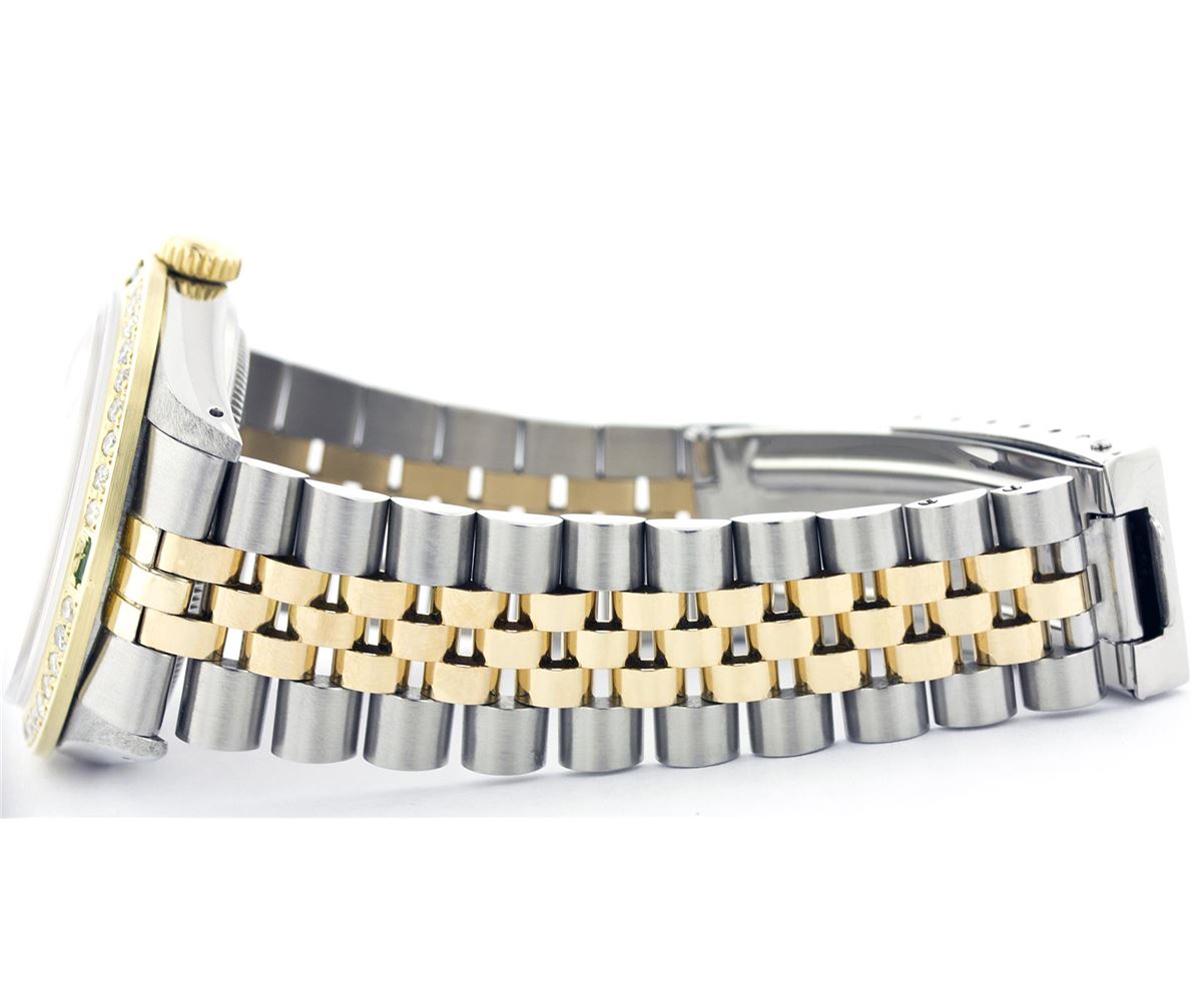 One Mens Two Tone Rolex Datejust Polished, Serviced & Electronically Tested, 14K Yellow Gold & Stainless Steel Case:36mm, 14K Yellow Gold Crown, Custom Bezel: 18K Yellow Gold Emerald Beadset Diamond Bezel, Diamond Count: 36 Diamonds + 4 Emeralds Total Weight 1.0 Carat, Clarity: Si-VS, Color: G to H. Custom Crystal: Synthetic Sapphire Cyclops Lens. Movement: Automatic Winding Movement Caliber 3035. Custom Dial: Mother Of Pearl String Diamond Dial, Diamond Count: 48 Diamonds + 10 Emeralds, Color: G to H, Clarity: SI-VS Date Window: 3 O'Clock Position Date Display, Quickset, Model: 16013 Condition: G-6 Extra Fine. Bracelet: Two Tone 14K Yellow Gold & Stainless Steel Jubilee. Bright Polish. 6.5 Inch Length, Adjustable. Standard Clasp, With Rolex Logo.