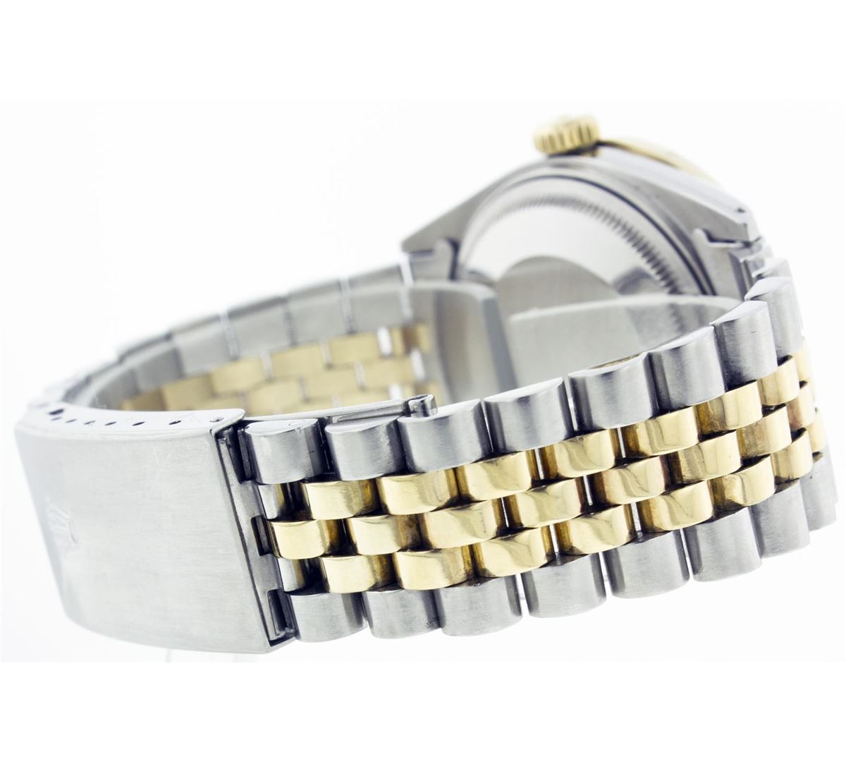 One Mens Two Tone Rolex Datejust Polished, Serviced & Electronically Tested, 14K Yellow Gold & Stainless Steel Case:36mm, 14K Yellow Gold Crown, Custom Bezel: 18K Yellow Gold Emerald Beadset Diamond Bezel, Diamond Count: 36 Diamonds + 4 Emeralds Total Weight 1.00 Carat, Clarity: Si-VS, Color: G to H. Custom Crystal: Synthetic Sapphire Cyclops Lens. Movement: Automatic Winding Movement Caliber 3035. Custom Refinished Dial: Green String Diamond Dial, Diamond Count: 58 Diamonds In Dial in Dial G To H In Color, SI-VS Clarity. Date Window: 3 O'Clock Position Date Display, Quickset, Model: 16013 Condition: G-6 Extra Fine. Bracelet: Two Tone 14K Yellow Gold & Stainless Steel Jubilee. Bright Polish. 6.5 Inch Length, Adjustable. Standard Clasp, With Rolex Logo.