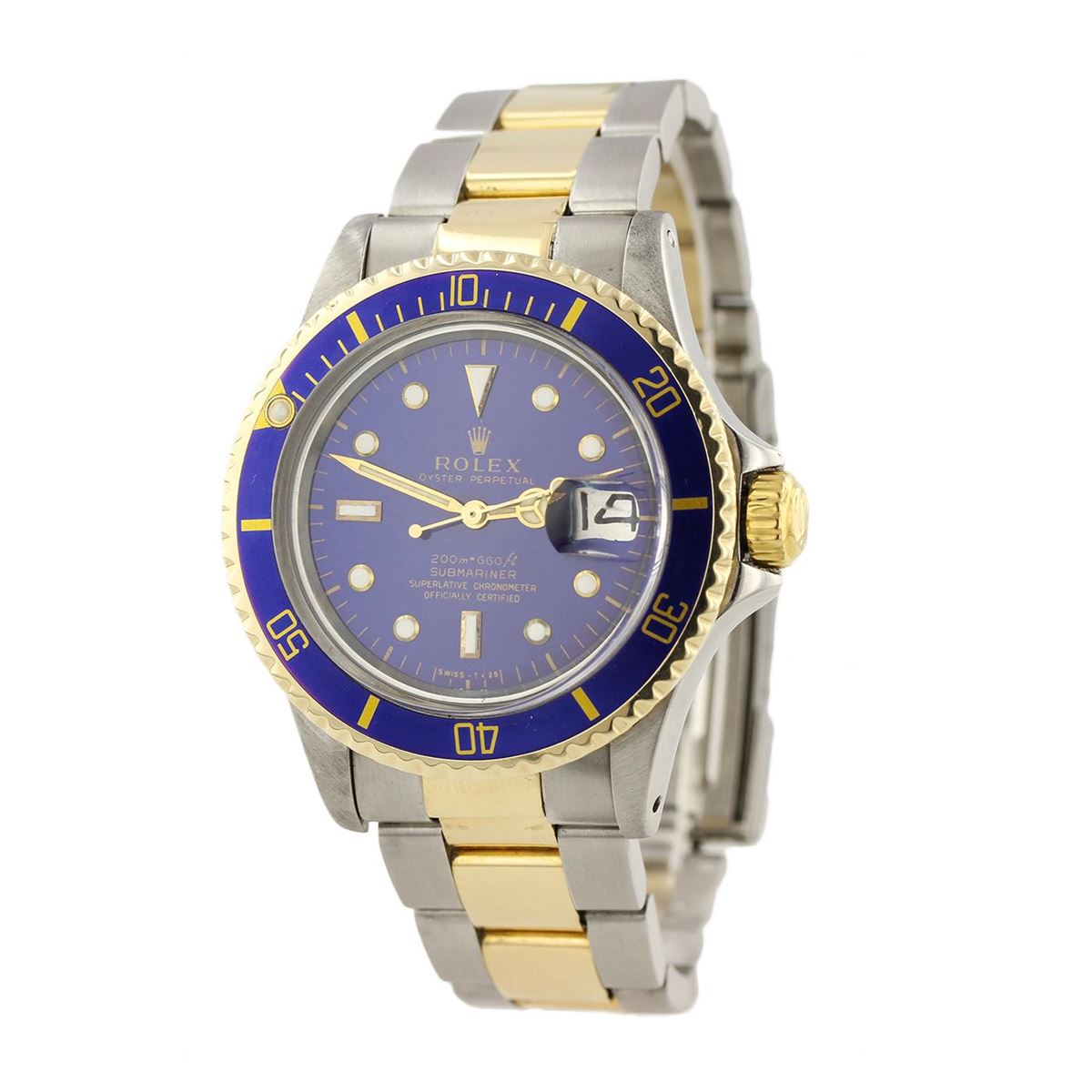 One gents, hand crafted & machine milled Rolex two tone Submariner wristwatch electronically tested, Stainless Steel Case: 39mm oyster, Water Resistant: 220 meters / 660 feet, 18KT yellow gold Crown: twin lock with logo, set within protective shoulders, Bezel: omni-directional time lapse rotatable blue disc, Custom Crystal: synthetic sapphire cyclops lens. Movement: superlative chronometer, Custom Dial: Blue, with pointed hands and indices, Circa: 1977, Date Window: 3 o'clock position, non-quick set, Oyster Bracelet: two tone stainless steel & 18KT yellow gold, Condition: G-5 Fine. Bright polish & brushed finish. Seven and three quarter inch length, adjustable. Flip lock clasp, with diver extension. Total Weight of Watch 122.43 grams. AIG Appraised at $11,000.00.