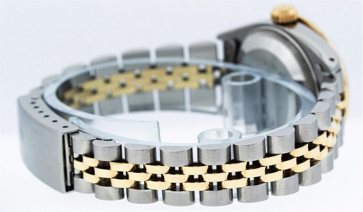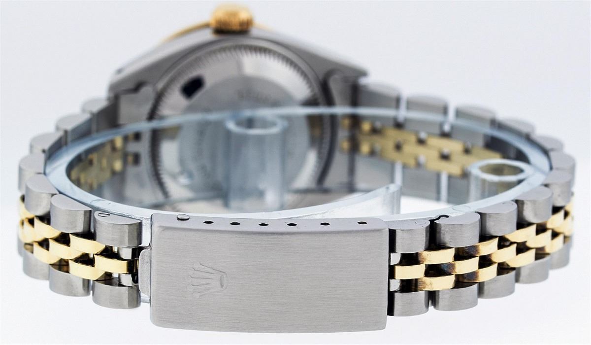One Ladies Two Tone Rolex Datejust Polished, Serviced & Electronically Tested, 14K Yellow Gold & Stainless Steel Case:26mm, 14K Yellow Gold Crown, Custom Bezel: 18K Yellow Gold Beadset Diamond Bezel, Stone Count: 32 Diamonds, Total Weight .70 Carat, Clarity: Si-VS, Color: G to H. Custom Crystal: Synthetic Sapphire Cyclops Lens. Movement: Automatic Winding Movement Caliber 2030. Custom Dial: Tahitian Mother Of Pearl Diamond Dial VVS, Stone Count: 10 Diamonds in Dial, Color: G to H, Clarity: VVS. Date Window: 3 O'Clock Position Date Display, Model: Datejust, Condition: G-6 Extra Fine. Bracelet: Two Tone 14K Yellow Gold & Stainless Steel Jubilee. Bright Polish. 5.5 Inch Length, Adjustable. Standard Clasp, With Rolex Logo. Comes with a 6 month warranty card.