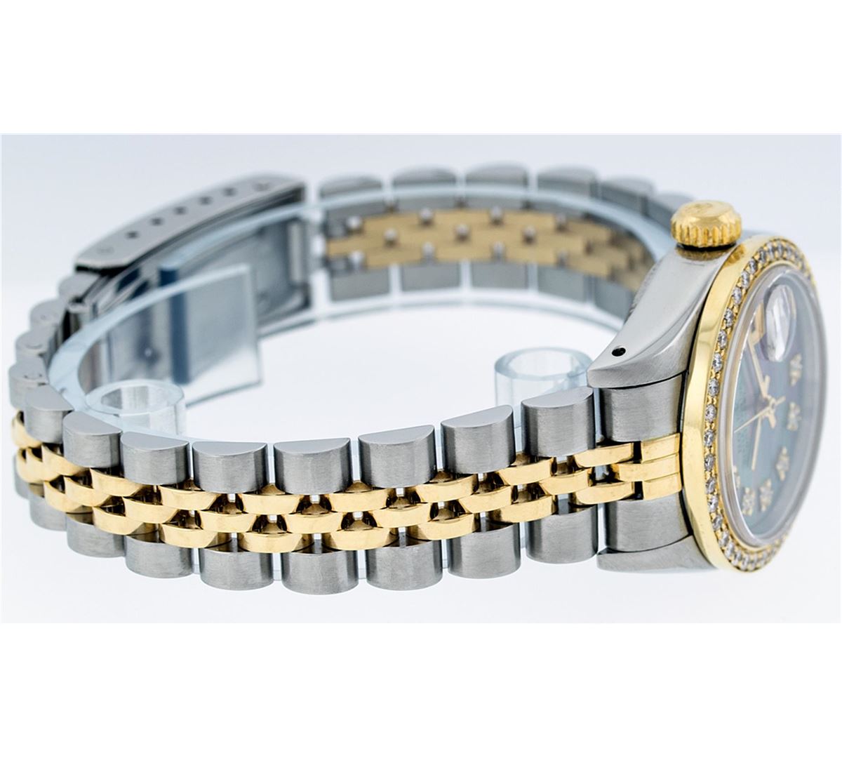 One Ladies Two Tone Rolex Datejust Polished, Serviced & Electronically Tested, 14K Yellow Gold & Stainless Steel Case:26mm, 14K Yellow Gold Crown, Custom Bezel: 18K Yellow Gold Beadset Diamond Bezel, Stone Count: 32 Diamonds, Total Weight .70 Carat, Clarity: Si-VS, Color: G to H. Custom Crystal: Synthetic Sapphire Cyclops Lens. Movement: Automatic Winding Movement Caliber 2030. Custom Dial: Tahitian Mother Of Pearl Diamond Dial VVS, Stone Count: 10 Diamonds in Dial, Color: G to H, Clarity: VVS. Date Window: 3 O'Clock Position Date Display, Model: Datejust, Condition: G-6 Extra Fine. Bracelet: Two Tone 14K Yellow Gold & Stainless Steel Jubilee. Bright Polish. 5.5 Inch Length, Adjustable. Standard Clasp, With Rolex Logo. Comes with a 6 month warranty card.