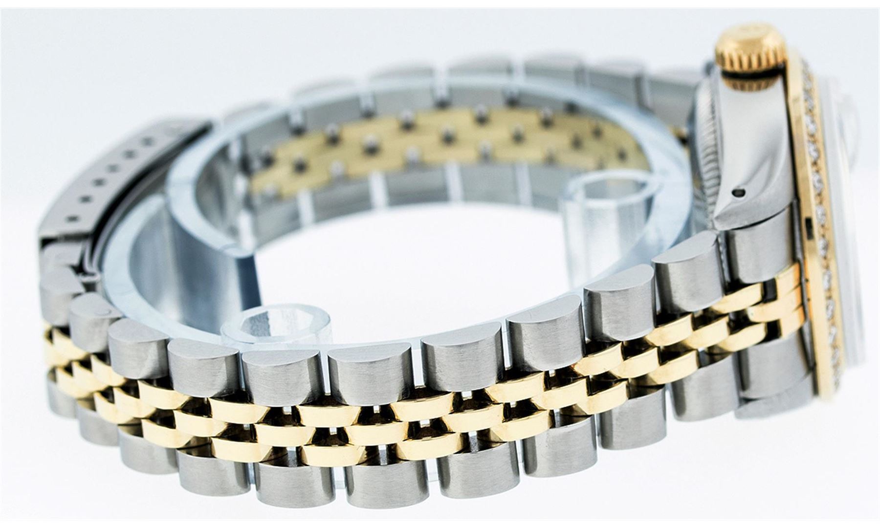 One Ladies Two Tone Rolex Datejust Polished, Serviced & Electronically Tested, 14K Yellow Gold & Stainless Steel Case:26mm, 14K Yellow Gold Crown, Custom Bezel: 18K Yellow Gold Beadset Diamond Bezel, Stone Count: 32 Diamonds, Total Weight .70 Carat, Clarity: Si-VS, Color: G to H. Custom Crystal: Synthetic Sapphire Cyclops Lens. Movement: Automatic Winding Movement Caliber 2030. Custom Dial: Tahitian Mother Of Pearl Diamond Dial VVS, Stone Count: 10 Diamonds in Dial, Color: G to H, Clarity: VVS. Date Window: 3 O'Clock Position Date Display, Model: Datejust, Condition: G-6 Extra Fine. Bracelet: Two Tone 14K Yellow Gold & Stainless Steel Jubilee. Bright Polish. 5.5 Inch Length, Adjustable. Standard Clasp, With Rolex Logo. Comes with a 6 month warranty card.