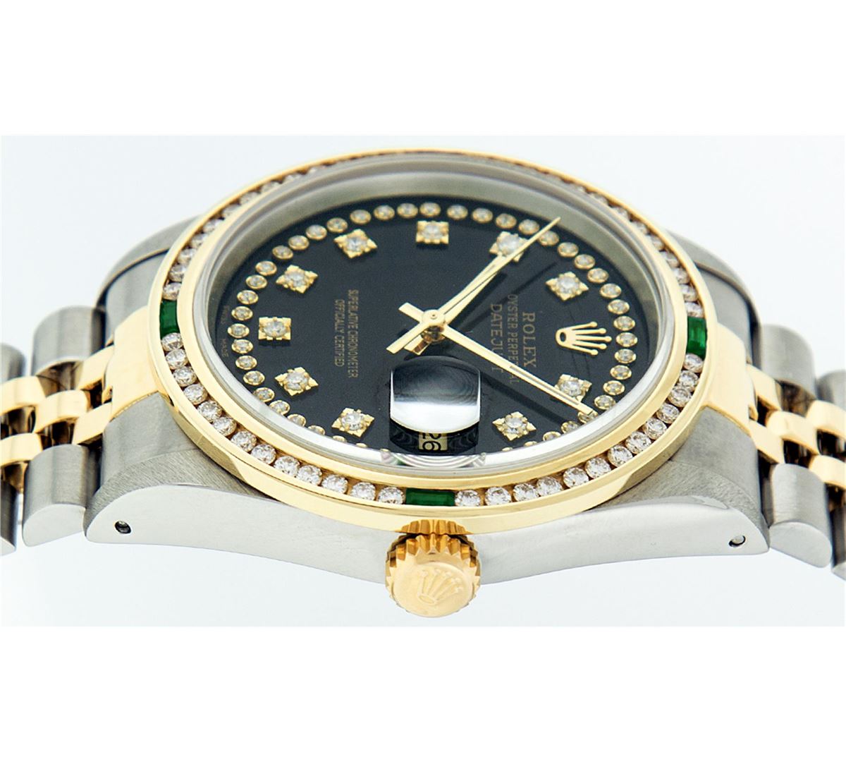 One Mens Two Tone Rolex Datejust Polished, Serviced & Electronically Tested, 14K Yellow Gold & Stainless Steel Case:36mm, 14K Yellow Gold Crown, Custom Bezel: 18K Yellow Gold Emerald Channel Set Diamond Bezel, Diamond Count: 52 Diamonds + 4 Emeralds, Total Weight 1.30 Carat, Clarity: SI-VS, Color: G to H. Custom Crystal: Synthetic Sapphire Cyclops Lens. Movement: Automatic Winding Movement Caliber 3035. Custom Dial: Black String Diamond Dial VVS , Diamond Count: 58 Diamonds in Dial G To H In Color, VVS Clarity. Date Window: 3 O'Clock Position Date Display, Quickset, Model: 16013 Condition: G-6 Extra Fine. Bracelet: Two Tone 14K Yellow Gold & Stainless Steel Jubilee. Bright Polish. 7.0 Inch Length, Adjustable. Standard Clasp, With Rolex Logo. Comes with 6 month warranty.