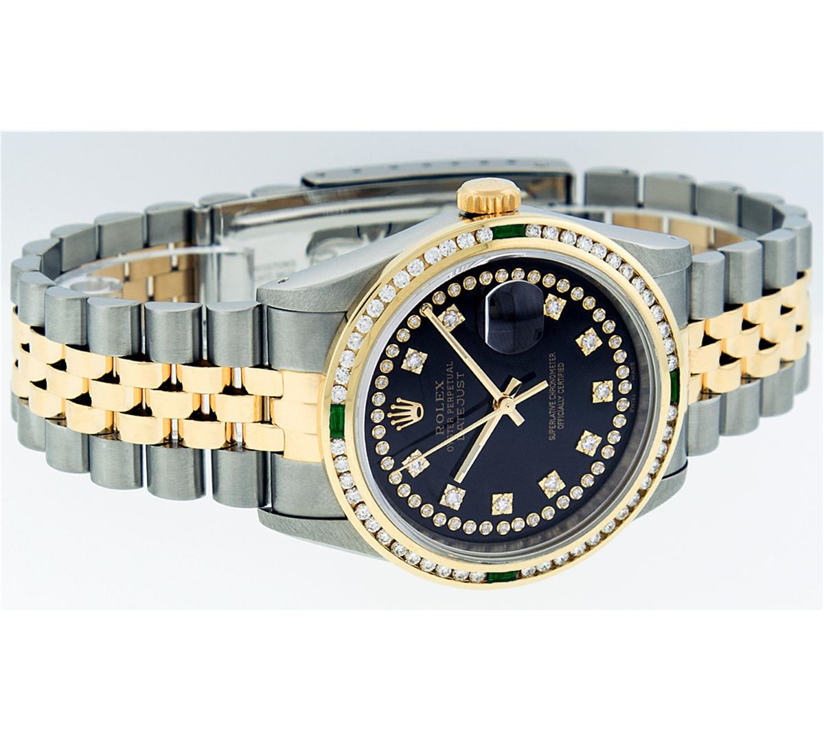 One Mens Two Tone Rolex Datejust Polished, Serviced & Electronically Tested, 14K Yellow Gold & Stainless Steel Case:36mm, 14K Yellow Gold Crown, Custom Bezel: 18K Yellow Gold Emerald Channel Set Diamond Bezel, Diamond Count: 52 Diamonds + 4 Emeralds, Total Weight 1.30 Carat, Clarity: SI-VS, Color: G to H. Custom Crystal: Synthetic Sapphire Cyclops Lens. Movement: Automatic Winding Movement Caliber 3035. Custom Dial: Black String Diamond Dial VVS , Diamond Count: 58 Diamonds in Dial G To H In Color, VVS Clarity. Date Window: 3 O'Clock Position Date Display, Quickset, Model: 16013 Condition: G-6 Extra Fine. Bracelet: Two Tone 14K Yellow Gold & Stainless Steel Jubilee. Bright Polish. 7.0 Inch Length, Adjustable. Standard Clasp, With Rolex Logo. Comes with 6 month warranty.